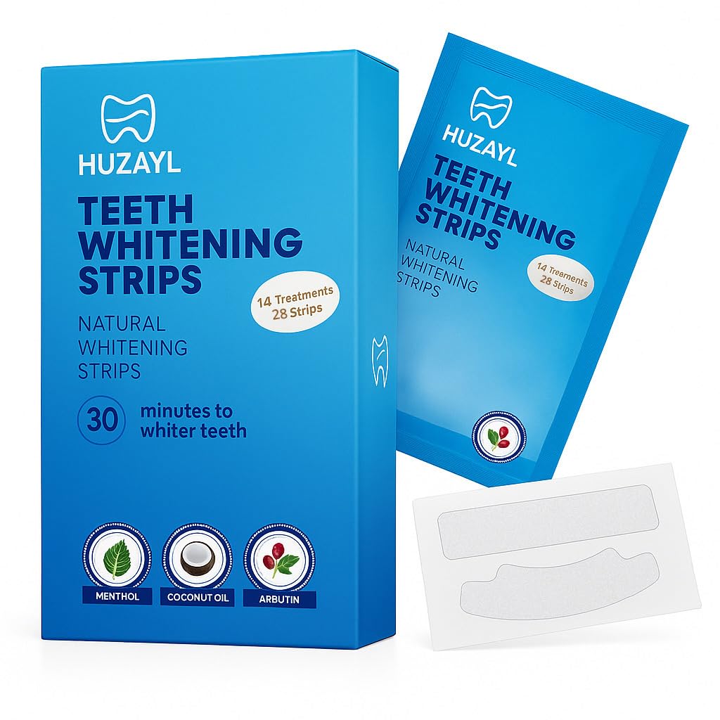 Fast, Long-Lasting Results with No Irritation – Get ready for noticeable results after just a few uses! Huzayl Whitening Strips deliver quick, effective whitening with results that last. They are perfect for daily use, providing a brighter smile with no irritation, enamel safe, and no peroxide-based side effects. Enjoy a fresh, confident smile all day, every day!. Convenient, Perfect for On-the-Go - Whitening your teeth has never been this easy or clean! Unlike traditional wet strips, our dry strips are easy to apply, and stay in place, making them perfect for busy schedules. Whether you're at home or on-the-go, you can whiten your teeth anytime, anywhere, without worrying about messy goo or slipping strips. Safe for You - Feel good about your whitening routine with Huzayl. Our strips are 100 vegan, cruelty-free, and free from chemicals, parabens, and artificial additives. We're committed to providing a safe, natural, and environmentally conscious way to achieve a whiter smile, just a healthier, cleaner approach to teeth whitening. Infused with Natural Ingredients for Oral Health - Packed with the power of Coconut Oil, Arbutin, Mint and Chlorophyllin-Copper Complex, our whitening strips go beyond just whitening! These ingredients remove stain, while Chlorophyllin-Copper Complex helps maintain fresh breath and promotes gum health. This natural combination ensures your smile is as healthy as it is bright, all without harsh chemicals. Whiten Your Smile, Gently Effectively - Achieve a stunning, whiter smile with Huzayl Whitening Strips! Our unique peroxide-free PAP formula gently removes stains while ensuring no sensitivity or enamel damage. Perfect for those with sensitive teeth and gums, our strips provide an effective whitening solution that leaves your smile radiant and healthy with every use.