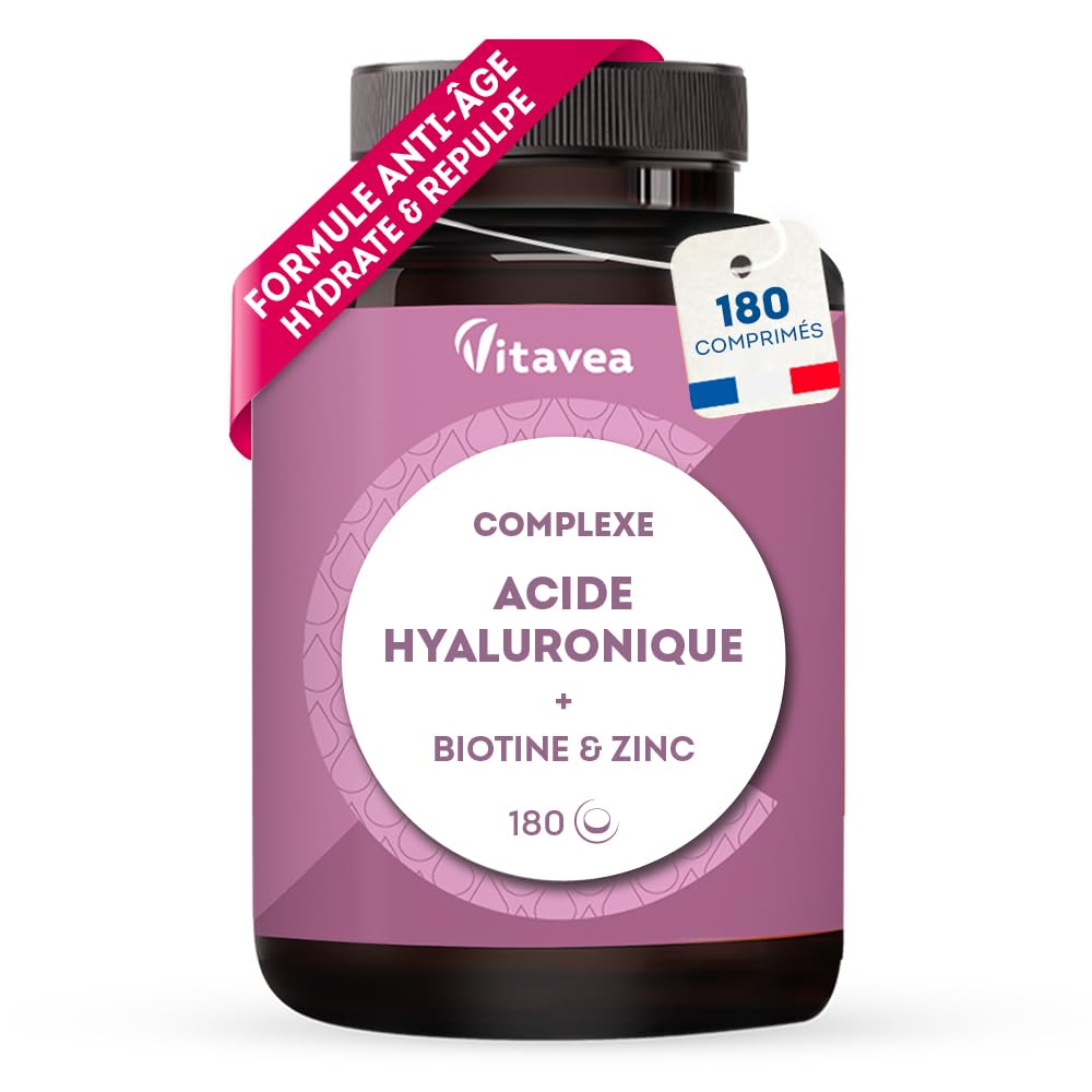 Hyaluronic Acid Food Supplement The VITAVEA HYALURONIC ACID formula is your ally for regaining radiant, elastic and supple skin. Our VITAVEA HYALURONIC ACID formula is a complete food supplement enriched with Zinc, Biotin and Bamboo to promote the beauty of your skin. Product Details Hyaluronic acid helps: - Maintain glowing skin - Improve the suppleness and elasticity of the skin - Improve the beauty of the skin About Vitavea Vitavea, specialist in natural well-being, offers you a wide range of products to take care of you. We are committed to supporting you in your well-being process and enabling you to find the product that meets your needs. Accessible to all, easy to use, our products fit ideally into your daily life. All our products are made in France, guaranteeing you quality and respect for manufacturing processes. With Vitavea, well-being and health are within reach! Ingredients Bulking agent: sorbitol sodium hyaluronate bamboo extract (Bambusa arundinacea) anti-caking agent: magnesium salts of fatty acids mineral: zinc oxide vitamin B8 Active content for 2 tablets Sodium hyaluronate 474mg including hyaluronic acid 400mg Bamboo extract 30mg Vitamin B8 (Biotin) 50µg (100 of NRV ) Zinc 10mg (100 of NRV ) NRV Nutritional Reference Values Directions for use 1 to 2 tablets per day with a large glass of water. Precautions for use Do not exceed the recommended daily dose. To be consumed as part of a varied and balanced diet and a healthy lifestyle. Store in a dry, cool place. Keep out of reach of children. Excessive consumption can have laxative effects. Not recommended for pregnant women. Consumption should be limited to a few weeks months INGREDIENTS Bulking agent: sorbitol sodium hyaluronate bamboo extract (Bambusa arundinacea) anti-caking agent: magnesium salts of fatty acids mineral: zinc oxide vitamin B8 DIRECTIONS FOR USE 1 to 2 tablets per day with a large glass of water. SAFETY WARNING Do not exceed the recommended daily dose. To be consumed as part of a varied and balanced diet and a healthy lifestyle. Store in a dry, cool place. Keep out of reach of children. Excessive consumption may have laxative effects. Not recommended for pregnant women. Consumption should be limited to a few weeks months. MADE IN FRANCE: The Hyaluronic Acid food supplement is made in France in our laboratories in Vendée, in compliance with manufacturing and quality processes. PRACTICAL AND LONG-LASTING TREATMENT: Thanks to a high dosage, 1 to 2 tablets per day provide you with all the benefits of hyaluronic acid. Our Vitavea Hyaluronic Acid contains 180 tablets, or a 3 to 6 month treatment. Developed by micronutrition experts, this food supplement is gluten-free, lactose-free, sugar-free, and gelatin-free. It is also formulated without artificial flavors or colors. ? ENRICHED WITH ZINC, BAMBOO, BIOTIN: Thanks to a formula enriched with biotin, zinc, and bamboo, 3 star active ingredients in the beauty sphere, our food supplement helps cover the skin's needs. Specially formulated to promote skin hydration and elasticity, thanks to hyaluronic acid, our food supplement supports you in your beauty routine. Your ally to prevent the signs of skin aging!. HIGH DOSAGE: Hyaluronic acid is one of the main constituents of our skin. It demonstrates an exceptional capacity to retain water in the cells, thus promoting the elasticity of the skin. But the production of hyaluronic acid decreases with age. This is why it is advisable to provide your body with it. Thanks to a high dosage of 400 mg of hyaluronic acid, our food supplement allows the skin to regain hydration, suppleness, elasticity and radiance. ANTI-AGING ACTION: Our Vitavea Hyaluronic Acid food supplement is the complete solution for anti-wrinkle action and plumped, hydrated and radiant skin. Its formula is based on a unique combination of recognized and acclaimed active ingredients for a comprehensive and effective action on the beauty of the skin: hyaluronic acid, zinc, biotin and bamboo. A must-have to integrate into your beauty routine! Complément Alimentaire Acide Hyaluronique La formule ACIDE HYALURONIQUE VITAVEA est votre alliée pour retrouver une peau éclatante, élastique et souple. Notre formule ACIDE HYALURONIQUE VITAVEA est un complément alimentaire complet enrichi en Zinc, Biotine et Bambou pour favoriser la beauté de votre peau. Détails du produit L'acide hyaluronique aide à : - Maintenir une peau éclatante - Améliorer la souplesse et l'élasticité de la peau - Améliorer la beauté de la peau A propos de Vitavea Vitavea, spécialiste du bien-être au naturel, vous propose une large gamme de produits pour prendre soin de vous. Nous avons à cœur de vous accompagner dans votre démarche bien-être et de vous permettre de trouver le produit qui répond à vos besoins. Accessibles à tous, faciles d'utilisation, nos produits s'intègrent idéalement dans votre vie quotidienne. Tous nos produits sont fabriqués en France, vous garantissant qualité et respect des processus de fabrication. Avec Vitavea, le bien-être et la santé sont à portée de main ! Ingrédients Agent de charge : sorbitol hyaluronate de sodium extrait de bambou (Bambusa arundinacea) anti-agglomérant : sels de magnésium d'acides gras minéral : oxyde de zinc vitamine B8 Teneur en actifs pour 2 comprimés Hyaluronate de sodium 474mg dont acide hyaluronique 400mg Extrait de bambou 30mg Vitamine B8 (Biotine) 50µg (100 des VNR ) Zinc 10mg (100 des VNR ) VNR Valeurs Nutritionnelles de Référence Conseils d'utilisation 1 à 2 comprimés par jour avec un grand verre d'eau. Précautions d'emploi Ne pas dépasser la dose journalière recommandée. À consommer dans le cadre d'une alimentation variée et équilibrée et d'un mode de vie sain. À conserver dans un endroit sec et frais. Garder hors de portée des enfants. Une consommation excessive peut avoir des effets laxatifs. Déconseillé aux femmes enceintes. La consommation doit être limitée à quelques semaines