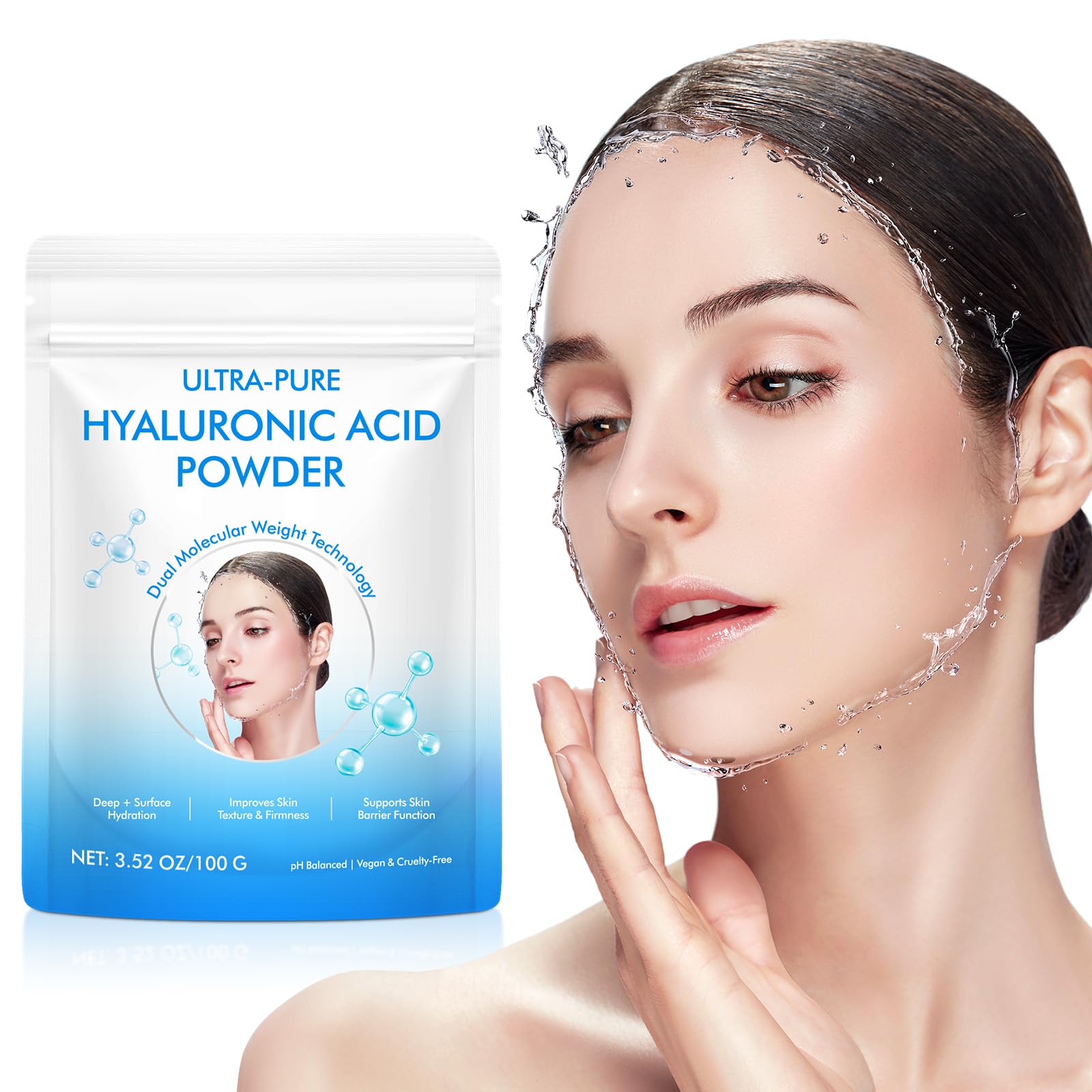 TRAVEL-FRIENDLY FREE FROM UNNECESSARY ADDITIVES——A compact, leak-proof solution compared to bulky liquid serums. Our formula is proudly vegan, cruelty-free, and free from fillers, parabens, and artificial colors, ensuring a pure and potent addition to your DIY skincare arsenal. PROMOTE A STRONGER MOISTURE BARRIER GLOWING SKIN——This versatile HA powder actively helps to enhance your skin's natural ability to retain moisture. Regular use supports a resilient skin barrier, leading to visibly plumper, smoother, and more radiant-looking skin. EASY-TO-USE DISSOLVES INSTANTLY FOR NO-HASSLE ROUTINE——Designed for seamless integration into your daily regimen. Our finely-milled powder blends quickly and completely with your products, eliminating any gritty texture for a smooth, effortless application every time. PURE, POWERFUL HYDRATION BOOST FOR ALL SKIN TYPES——Experience intense moisture infusion with our 100 pure hyaluronic acid powder. This concentrated formula helps reduce the appearance of fine lines, plumps skin, and supports a healthier, dewier complexion for sensitive, dry, and oily skin. UNLOCK CUSTOMIZABLE SKINCARE MAXIMIZE SAVINGS——Create your ideal potency by mixing this hyaluronic acid powder into your favorite serums, moisturizers or toners. A cost-effective alternative to pre-diluted HA serums, offering unparalleled value without compromising quality.