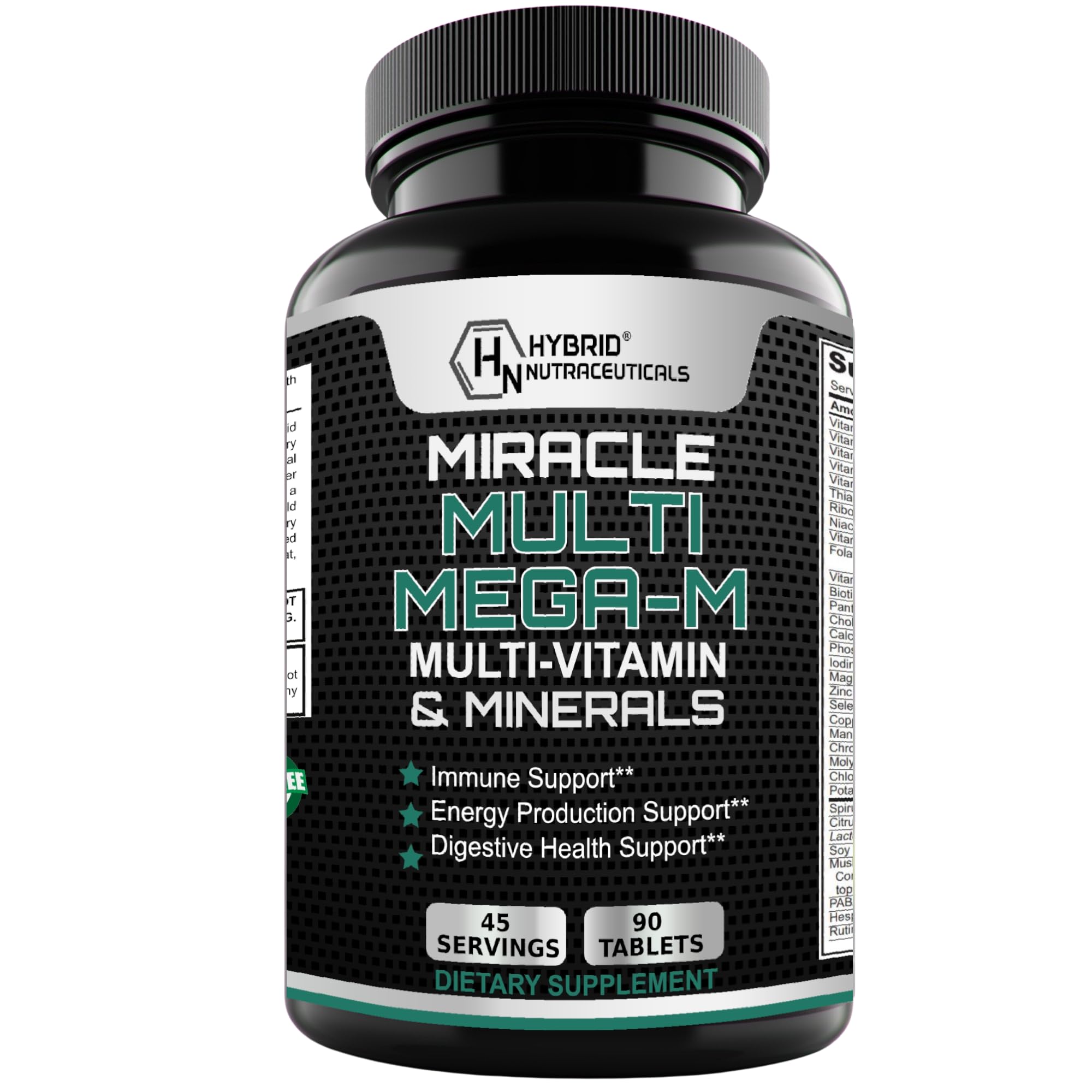 Quality and Value. You get 90 multivitamin multimineral tablets and 45 serviings. Also great for women 50 plus and men 50 plus. Potent Multivitamins with Whole Foods. Helps support your optimal heart helth, mental sharpness and immune support. Does your multivitamin have probiotics, enzymes and superfoods? Hybrid Nutraceuticals MEGA-M is made in the USA at an FDA inspected facility under strict cGMP standards.