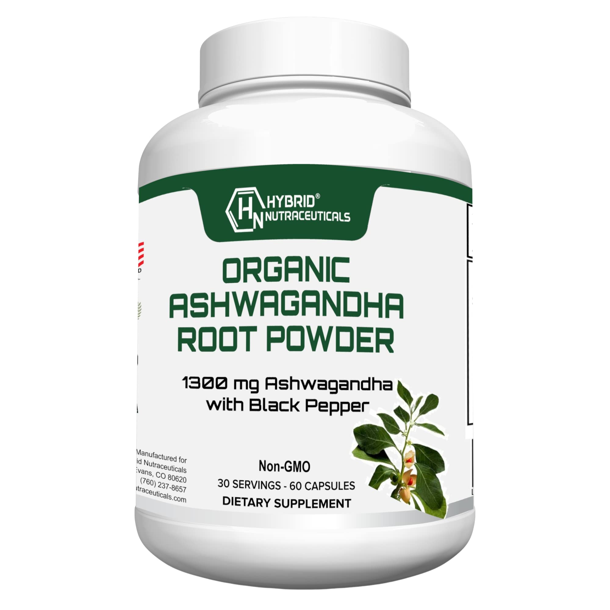 Hybrid Nutraceuticals Organic Ashwagandha Root Powder Capsules 1300mg with Black Pepper Extract - Stress and Immune Support - 60 Capsules