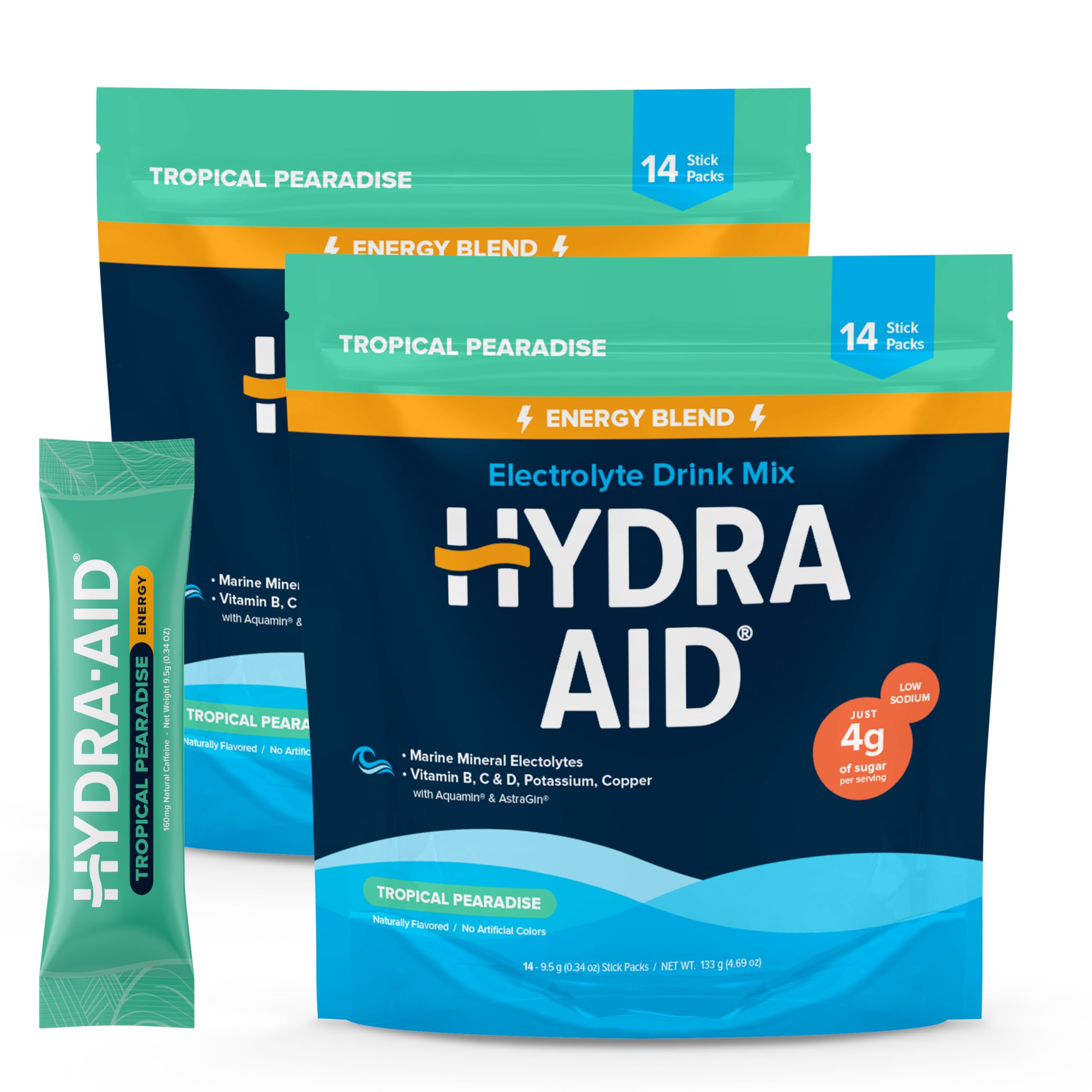 HYDRA AID Low Sodium Electrolyte Powder Packets - Marine-Mineral Hydration Mix with Vitamins B C D | No Salty Aftertaste | Pack of 2 | 28 Tropical Pearadise Sticks | Vegan Non-GMO Gluten Free