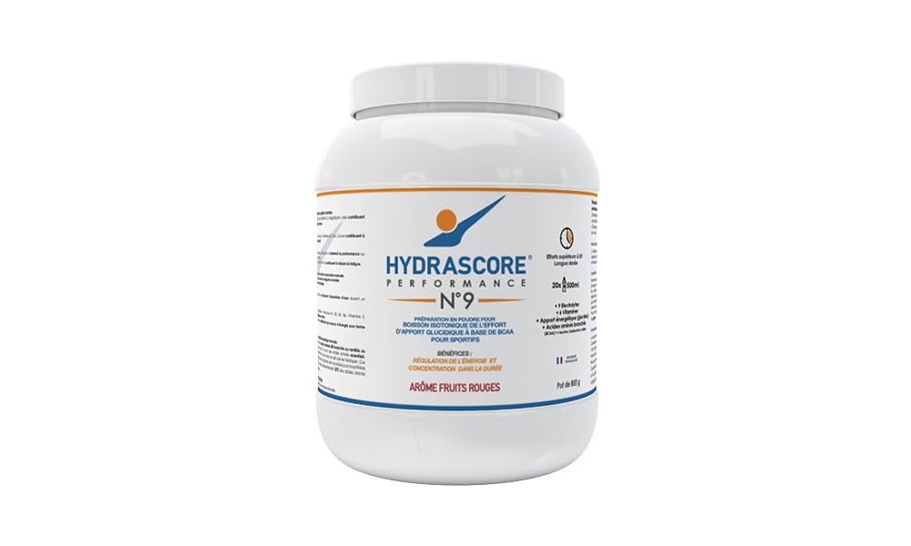 BOOST YOUR PERFORMANCE - Hydrascore N 9 isotonic drink is a powder preparation that compensates for water and mineral losses during long-term efforts. Thanks to its composition of 9 electrolytes, 6 vitamins, carbohydrates and BCAA 2.1.1 (L-Leucine, L-Isoleucine, L-Valine), it helps maintain performance and delay fatigue during your efforts lasting more than 2 hours: running, trail, triathlon, cycling, mountain biking, etc. FLASH HYDRATION - Hydrascore N 9 helps you compensate for the loss of water and electrolytes during your endurance efforts. Our isotonic drink rehydrates faster than water and rebalances the minerals that leak with each drop of sweat (sodium, potassium, magnesium, zinc). Result: muscles and a circulatory system that are well irrigated to keep up your pace until the end of the effort! ? ENERGY BOOST - With its supercharged carbohydrates (sucrose, maltodextrin and dextrose), it's 275 kcal L that propels you to the finish line. Add to that vitamins and BCAAs for a strengthened mind, marathon endurance and rapid recovery. Product certified anti-doping by the NF EN 17444 standard. RED FRUIT FLAVOR - Because hydrating is even better when it tastes good, our Hydrascore N 9 with red fruit flavor transforms each sip into pleasure. Not very sweet, not cloying and easy to prepare: you just need to mix 2 measuring spoons of powder (40 g) with 460 ml of water. Drink between 500 ml and 1 L per hour of exercise for optimal absorption. The 800 g resealable jar allows you to prepare 20 cans of 500 ml. MADE IN FRANCE - Hydrascore is the French specialist in sports nutrition solutions for endurance activities. Our formulas are designed and manufactured in our laboratories in the West of France. Adapted to each effort, they support you in achieving and exceeding your goals! INGREDIENTS Sucrose, maltodextrin, dextrose, minerals (sodium citrate, potassium citrate, sodium chloride, magnesium citrate, iron pyrophosphate, zinc, manganese and copper sulfates, potassium iodate, sodium selenite), amino acids (L-leucine, L-isoleucine, L-valine), flavors, concentrated red beet juice (including acidifier: citric acid), colors: cochineal carmine, beta-carotene, vitamins (C, E, B3, B1, B6, B2). May contain traces of cereals containing GLUTEN, MILK, EGG, SOY. DIRECTIONS FOR USE Store in a dry place, close the lid tightly after use. SAFETY WARNING Contains traces of cereals containing GLUTEN, MILK, EGG, SOY. MADE IN FRANCE - Hydrascore is the French specialist in sports nutrition solutions for endurance activities. Our formulas are designed and manufactured in our laboratories in the West of France. Adapted to each effort, they support you in achieving and exceeding your goals! RED FRUIT FLAVOR - Because hydration is even better when it tastes good, our Hydrascore N 9 with red fruit flavor transforms every sip into a pleasure. Low in sugar, not sickening and easy to prepare: simply mix 2 measuring spoons of powder (40 g) with 460 ml of water. Drink between 500 ml and 1 L per hour of exercise for optimal absorption. The resealable 800 g jar allows you to prepare 20 500 ml bottles. ? ENERGY BOOST - With its supercharged carbohydrates (sucrose, maltodextrin and dextrose), it's 275 kcal L that will propel you to the finish line. Add to that vitamins and BCAAs for a strengthened mind, marathon endurance and express recovery. Product certified anti-doping by the NF EN 17444 standard. FLASH HYDRATION - Hydrascore N 9 helps you compensate for the loss of water and electrolytes during your endurance efforts. Our isotonic drink rehydrates faster than water and rebalances the minerals that escape with every drop of sweat (sodium, potassium, magnesium, zinc). Result: well-irrigated muscles and a circulatory system to keep up your pace until the end of the effort! BOOST YOUR PERFORMANCE - Hydrascore N 9 isotonic drink is a powder preparation that compensates for water and mineral losses during long-term efforts. Thanks to its composition of 9 electrolytes, 6 vitamins, carbohydrates and BCAA 2.1.1 (L-Leucine, L-Isoleucine, L-Valine), it helps maintain performance and delay fatigue during your efforts lasting more than 2 hours: running, trail running, triathlon, cycling, mountain biking, etc. BOOSTEZ VOS PERFORMANCES - La boisson isotonique Hydrascore N 9 est une préparation en poudre qui compense les pertes en eau et en minéraux lors des efforts de longue durée. Grâce à sa composition de 9 électrolytes, 6 vitamines, glucides et BCAA 2.1.1 (L-Leucine, L-Isoleucine, L-Valine), elle aide à maintenir les performances et retarder la fatigue lors de vos efforts supérieurs à 2 heures : running, trail, triathlon, vélo, VTT…. HYDRATATION ÉCLAIR - Hydrascore N 9 vous aide à pallier la perte d'eau et d'électrolytes lors de vos efforts d'endurance. Notre boisson isotonique réhydrate plus vite que l'eau et rééquilibre les minéraux qui fuient à chaque goutte de sueur (sodium, potassium, magnésium, zinc). Résultat : des muscles et un système circulatoire bien irrigués pour tenir son rythme jusqu'au bout de l'effort ! ? BOOST ÉNERGÉTIQUE - Avec ses glucides survitaminés (saccharose, maltodextrine et dextrose), c'est 275 kcal L qui vous propulsent jusqu'à la ligne d'arrivée. Ajoutez à cela des vitamines et des BCAA pour un mental renforcé, une endurance de marathonien et une récupération express. Produit certifié anti-dopage par la norme NF EN 17444. ARÔME FRUITS ROUGES - Parce que s'hydrater, c'est encore mieux quand ça a du goût, notre Hydrascore N 9 à la saveur fruits rouges transforme chaque gorgée en plaisir. Peu sucré, pas écœurant et facile à préparer : il vous suffit de mélanger 2 cuillères doseuses de poudre (40 g) avec 460 ml d'eau. Boire entre 500 ml et 1 L par heure d'effort pour une absorption optimale. Le pot de 800 g refermable vous permet de préparer 20 bidons de 500 ml. FABRIQUÉ EN FRANCE - Hydrascore est le spécialiste français des solutions de nutrition sportive pou