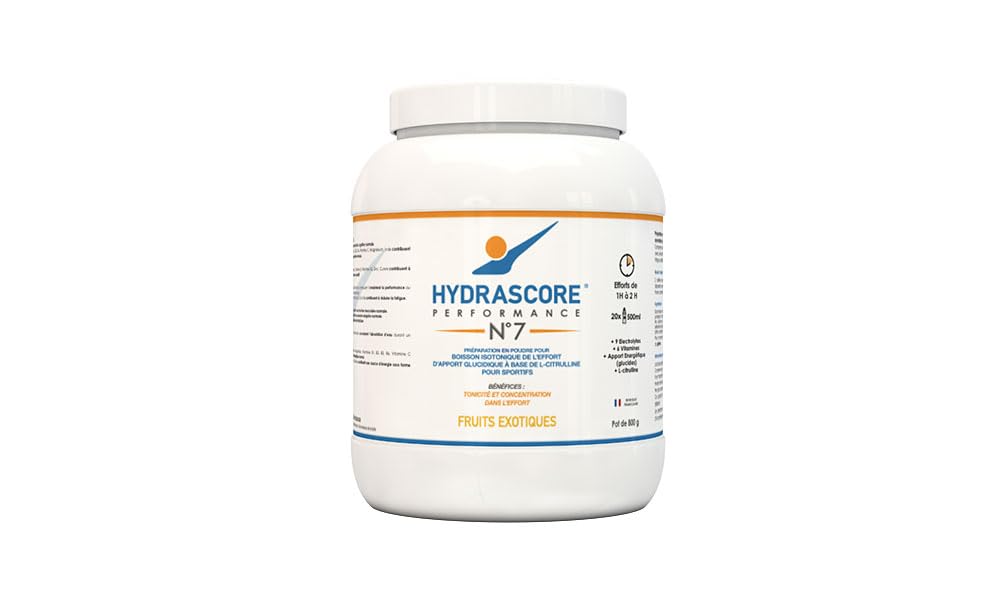 Our isotonic drink compensates for water and mineral losses during your sports sessions. Its action? Effectively hydrate your tissues, support muscle tone, promote thermoregulation and help eliminate toxins. Its innovative formula stimulates your muscle energy and reduces the feeling of fatigue. Choose Hydrascore N 7 for maximum hydration during your training sessions and competitions lasting 1 to 2 hours. INGREDIENTS Sucrose, maltodextrin, dextrose, minerals (sodium citrate, potassium citrate, sodium chloride, magnesium citrate, iron pyrophosphate, zinc, manganese and copper sulfates, potassium iodate, sodium selenite), L-citrulline, safflower extract, flavorings, color: caramel E150c, vitamins (C, E, B3, B1, B6, B2). May contain traces of cereals containing GLUTEN, MILK, EGG, SOY.MADE IN FRANCE - Hydrascore is the French specialist in sports nutrition solutions for endurance activities. Our formulas are designed and manufactured in our laboratories in the West of France. Adapted to each effort, they support you in achieving and exceeding your goals!. EXOTIC FRUIT FLAVOR - Because hydration is even better when it tastes good, our Hydrascore N 7 with exotic fruit flavor transforms every sip into a pleasure. Low in sugar, not sickening and easy to prepare: simply mix 2 measuring spoons of powder (40 g) with 460 ml of water. Drink between 500 ml and 1 L per hour of exercise for optimal absorption. The resealable 800 g jar allows you to prepare 20 500 ml bottles. ? ENERGY BOOST - With its supercharged carbohydrates (sucrose, maltodextrin and dextrose), it's 296 kcal L that will propel you to the finish line. Add to that vitamins and L-Citruline for a strengthened mind, reduced fatigue and rapid recovery. Product certified anti-doping by the NF EN 17444 standard. FLASH HYDRATION - Hydrascore N 7 helps you compensate for the loss of water and electrolytes during your endurance efforts. Our isotonic drink rehydrates faster than water and rebalances the minerals that escape with each drop of sweat (sodium, potassium, magnesium, zinc). Result: well-irrigated muscles and a circulatory system to keep up your pace until the end of the effort! BOOST YOUR PERFORMANCE - Hydrascore N 7 isotonic drink is a powder preparation that compensates for water and mineral losses during medium-duration efforts. Thanks to its composition of 9 electrolytes, 6 vitamins, carbohydrates and L-Citruline, it helps maintain performance and delay fatigue during your efforts of 1 to 2 hours: running, trail running, cycling, mountain biking, gravel…. Notre boisson isotonique compense les pertes en eau et en minéraux durant vos séances de sport. Son action ? Hydrater efficacement vos tissus, soutenir la tonicité musculaire, favoriser la thermorégulation et aider à éliminer les toxines. Sa formule innovante stimule votre énergie musculaire et réduit la sensation de fatigue. Optez pour Hydrascore N 7 pour une hydratation maximale lors de vos séances d'entraînements et compétitions de 1 à 2 heures. INGRÉDIENTS Saccharose, maltodextrine, dextrose, minéraux (citrate de sodium, citrate de potassium, chlorure de sodium, citrate de magnésium, pyrophosphate de fer, sulfates de zinc, de manganèse et de cuivre, iodate de potassium, sélénite de sodium), L-citrulline, extrait de carthame, arômes, colorant : caramel E150c, vitamines (C, E, B3, B1, B6, B2). Peut contenir des traces de céréales contenant du GLUTEN,LAIT, ŒUF, SOJA.FABRIQUÉ EN FRANCE - Hydrascore est le spécialiste français des solutions de nutrition sportive pour les activités d'endurance. Nos formules sont imaginées et fabriquées dans nos laboratoires dans l'Ouest de la France. Adaptées à chaque effort, elles vous accompagnent dans la réalisation et le dépassement de vos objectifs !. ARÔME FRUITS EXOTIQUES - Parce que s'hydrater, c'est encore mieux quand ça a du goût, notre Hydrascore N 7 à la saveur fruits exotiques transforme chaque gorgée en plaisir. Peu sucré, pas écœurant et facile à préparer : il vous suffit de mélanger 2 cuillères doseuses de poudre (40 g) avec 460 ml d'eau. Boire entre 500 ml et 1 L par heure d'effort pour une absorption optimale. Le pot de 800 g refermable vous permet de préparer 20 bidons de 500 ml. ? BOOST ÉNERGÉTIQUE - Avec ses glucides survitaminés (saccharose, maltodextrine et dextrose), c'est 296 kcal L qui vous propulsent jusqu'à la ligne d'arrivée. Ajoutez à cela des vitamines et de la L-Citruline pour un mental renforcé, une fatigue réduite et une récupération express. Produit certifié anti-dopage par la norme NF EN 17444. HYDRATATION ÉCLAIR - Hydrascore N 7 vous aide à pallier la perte d'eau et d'électrolytes lors de vos efforts d'endurance. Notre boisson isotonique réhydrate plus vite que l'eau et rééquilibre les minéraux qui fuient à chaque goutte de sueur (sodium, potassium, magnésium, zinc). Résultat : des muscles et un système circulatoire bien irrigués pour tenir son rythme jusqu'au bout de l'effort !. BOOSTEZ VOS PERFORMANCES - La boisson isotonique Hydrascore N 7 est une préparation en poudre qui compense les pertes en eau et en minéraux lors des efforts de moyenne durée. Grâce à sa composition de 9 électrolytes, 6 vitamines, glucides et L-Citruline, elle aide à maintenir les performances et retarder la fatigue lors de vos efforts de 1 à 2 heures : running, trail, vélo, VTT, gravel….