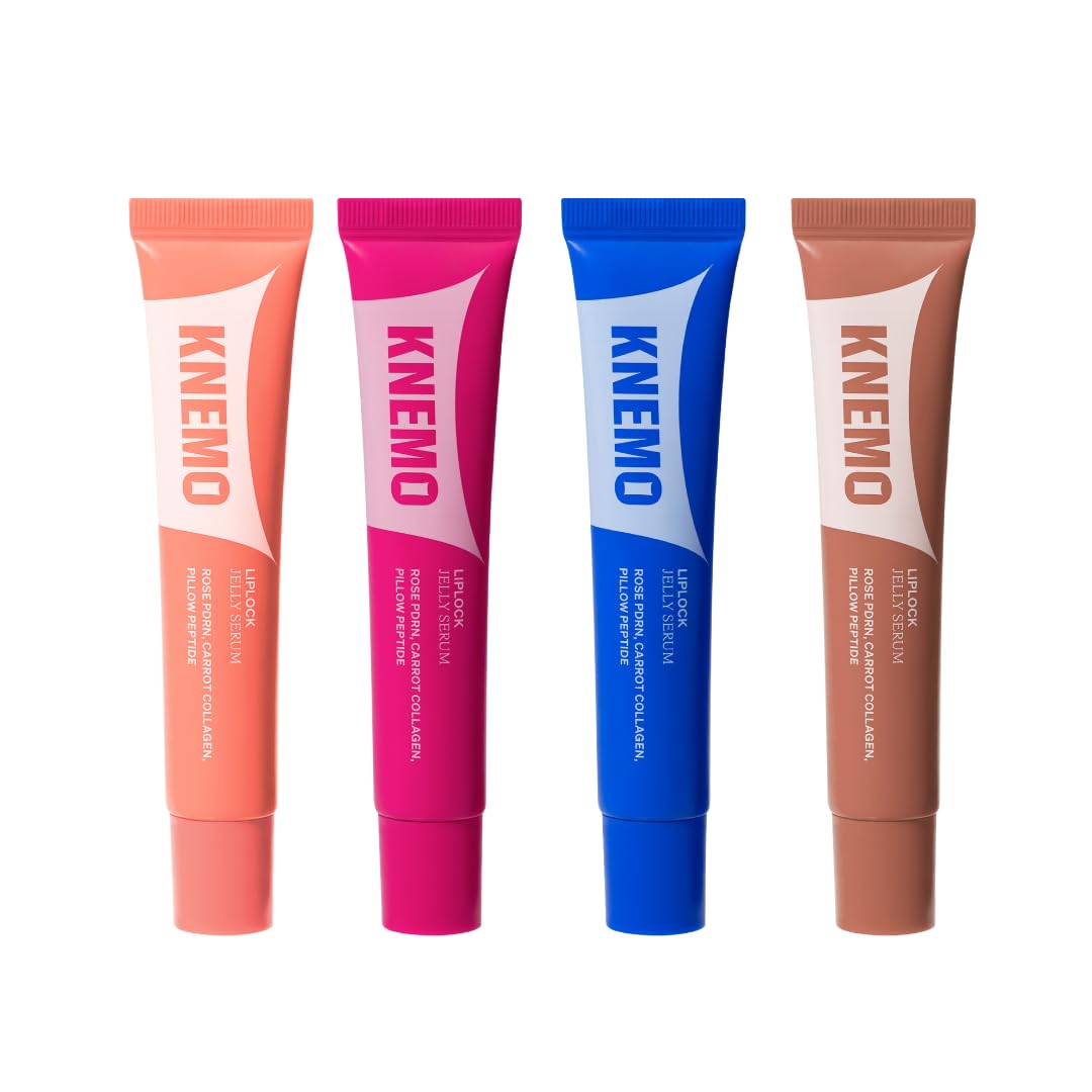 Treat your lips to the full KNEMO experience with this complete collection of our bestselling LipLock Jelly Serums. This 4-pack includes all shades—one clear and three sheer tints—for every mood, every moment. Powered by K-beauty's most advanced lip-care ingredients, each balm is infused with: Pillow Peptides for plush, cushiony softness Rose PDRN to support lip regeneration Carrot Collagen to help plump and firm 100 vegan and cruelty-free, these jelly balms glide on with a juicy shine and a non-sticky finish—perfect for daytime gloss or overnight hydration. Bundle Includes: Crystal Clear – Fragrance-free, hydrating pure Peach Muse – Sheer pink with a hint of coral Grape Crush – Soft purple tint with sweet scent Pink Flan – Warm taupe for a subtle, everyday glow
