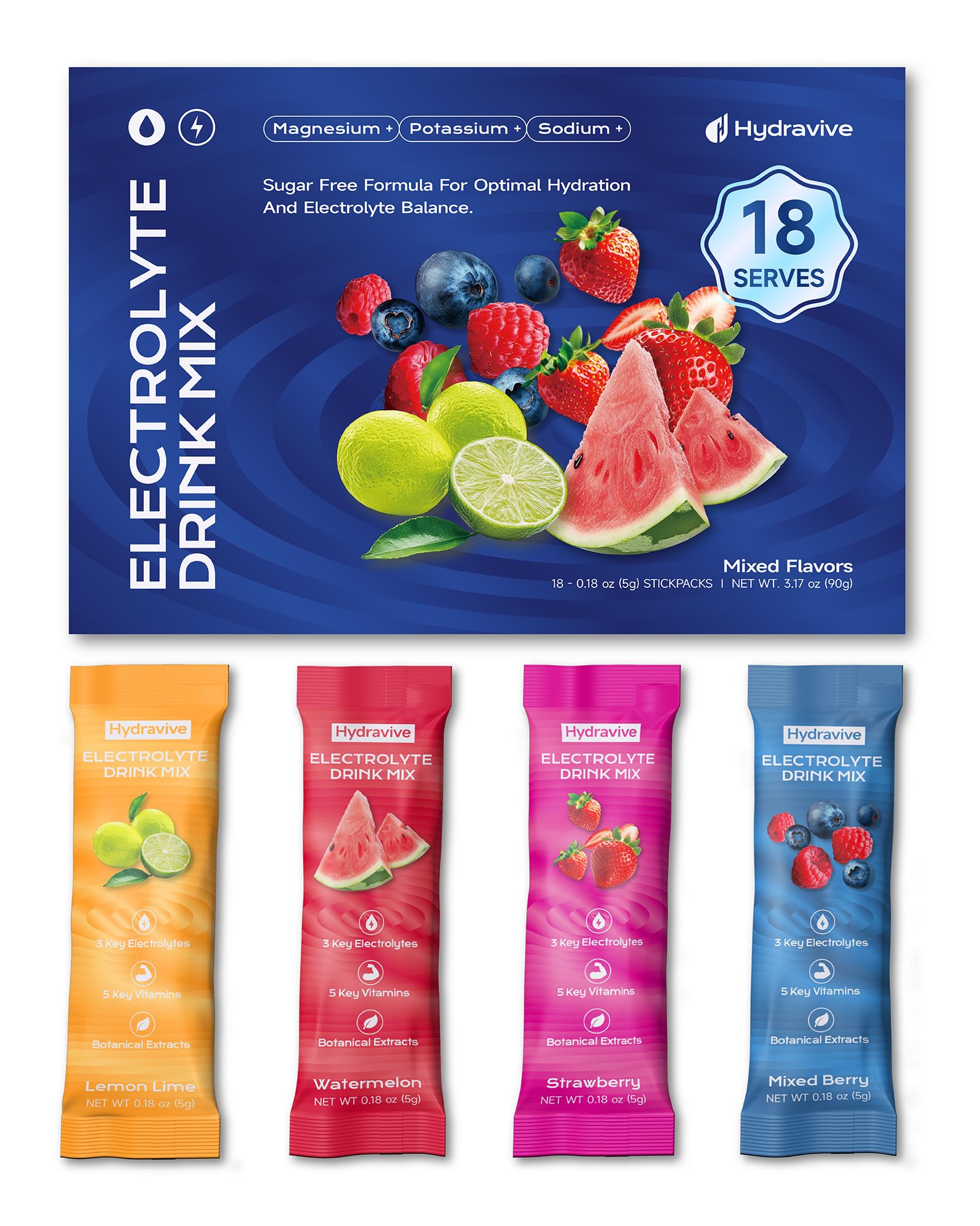 Hydravive Electrolytes Powder Wellness: Each lightweight 5g stick mixes in water: just pure hydration. Convenient and portable, it's easy to carry in your gym bag, desk, or travel kit, providing an 18-day supply of science-backed hydration, vitality, and mental clarity. Whether you're at the gym, at work, or on-the-go, Hydravive ensures you stay refreshed and energized. Available in five refreshing, natural fruit flavors: Watermelon, Strawberry, Mixed Berry, Lemon Lime, and Variety Pack. Hydravive Electrolytes Powder Energy Support: Infused with L-Theanine and Ashwagandha, Hydravive promotes calm alertness, helping you stay focused during workouts, travel, or high-pressure deadlines. With no THC, gluten, or artificial additives, this formula supports mental clarity and reduces stress naturally. Natural coconut water powder enhances hydration with balanced minerals for optimal absorption and a crisp, clean taste. Hydravive Electrolytes Powder Boost: With zero added sugar and naturally sweetened, Hydravive provides guilt-free energy to power your day. Packed with 283 DV of Vitamin B12 and 135 DV of Vitamin B6, it helps convert food into fuel for sustained energy. Additionally, 125 DV Vitamin D3 and 104 DV Vitamin C, along with 21 DV Zinc, strengthen immunity and protect against oxidative stress. Combined with coconut water powder, it delivers a refreshing tropical boost, perfect for fueling your body and supporting overall health. Hydravive Electrolyte Powder Recovery: Formulated with 1,000 mg of total electrolytes, including 400 mg of sodium, 100 mg of magnesium, potassium, and naturally occurring minerals from coconut water, Hydravive supports hydration and electrolyte replenishment beyond water alone to help maintain fluid balance and normal muscle function. Enhanced with Ashwagandha to support stress balance and Hericium erinaceus (Lion's Mane mushroom) to support focus and mental clarity, Hydravive is ideal for post-workout recovery, long workdays, travel, or anytime you need clean hydration and sustained energy—without added sugars. Hydravive Electrolytes Powder with Natural Coconut Water: combines natural coconut water powder—nature's electrolyte—with four essential electrolytes (Sodium, Magnesium, Potassium, Zinc) to rapidly replenish fluids. Enhanced with five energy-boosting vitamins (B6, B12, D3, C, Pantothenic Acid) and stress-fighting adaptogens (500mg Ashwagandha, 50mg Hericium erinaceus, 50mg L-Theanine), Hydravive is the perfect solution for athletes, busy professionals, or anyone in need of rapid hydration, mental clarity, and a naturally crisp taste.