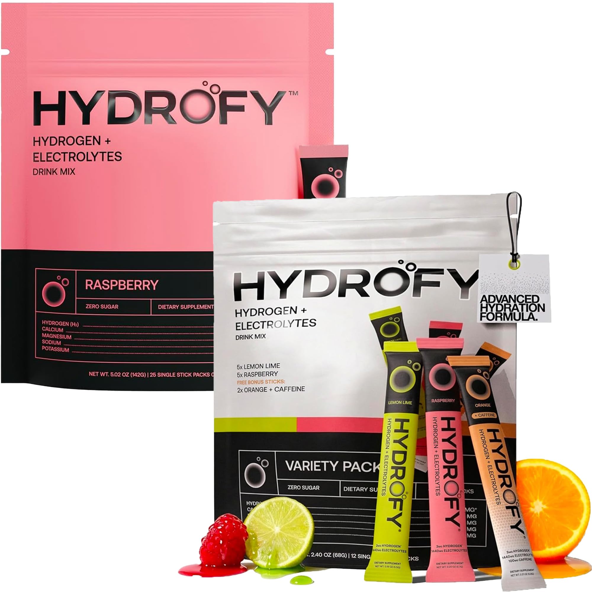 Hydrofy isn't just another electrolyte packet—it's a complete upgrade to how your body hydrates, performs, and recovers. This bundle pairs our fruity Raspberry (25 ct) with our Variety Pack (12 ct), giving you 37 servings to stock up on your caffeine-free favorite while sampling all three flavors. Each serving delivers 3mg of molecular hydrogen (equivalent to 12 PPM from a hydrogen water bottle), activating visible bubbles when mixed. Hydrogen penetrates deep into your cells, crosses the blood–brain barrier, and supports mitochondrial energy production. Research shows H2 helps neutralize harmful free radicals, reduce oxidative stress, improve endurance, accelerate post-workout recovery, and support long-term cellular health. Hydrofy uses a precise electrolyte ratio: 500mg potassium, 250mg sodium, 100mg magnesium, and 100mg calcium, plus trace minerals and vitamin C for immune support. The clean formula contains zero sugar, zero artificial flavors, zero dyes, and zero fillers—ideal for keto, fasting, gluten-free, and low-carb lifestyles. Mix one packet with 16–32 oz of water. Hydrogen activates immediately—drink within 15 minutes for best results. This is hydration, upgraded.The Science Behind Hydrofy's Molecular Hydrogen: Molecular hydrogen is a powerful antioxidant so small it can penetrate every cell in your body. Hydrofy's 3mg (12PPM equivalent) H2 selectively neutralizes harmful free radicals, protects against oxidative stress, and supports faster recovery. Backed by 2,000 published studies for energy production and long-term cellular health. How It Works—Molecular Hydrogen Activates on Contact: Mix one packet with 16–32 oz of water and watch hydrogen activate—visible bubbles show H2 being released. Each serving delivers up to 3mg of molecular hydrogen. Drink within 15 minutes for optimal cellular absorption. Backed by extensive studies, hydrogen supports energy production and reduces oxidative stress. Clean, Sugar-Free Formula with Essential Minerals: Zero sugar, zero artificial flavors, zero dyes, zero junk. Clean, functional hydration designed for how your body actually works—compatible with gluten-free, keto, fasting, low-carb, and active lifestyles. Great for weight management and GLP-1 journeys to replenish what your body is missing. Smarter Electrolytes Designed for Real Deficiencies: Most electrolytes overload you with sodium. Hydrofy uses an optimized blend (500mg potassium, 250mg sodium, 100mg magnesium, 100mg calcium) for what your body actually needs for muscle function, nerve signaling, and sustained energy. Plus a mineral complex (zinc, iron, and more) and vitamin C for immune support. Bundle Save—Full-Size Raspberry Variety Sampler: Get Raspberry (25 ct) plus our Variety Pack (12 ct with 4 of each flavor) in one value bundle. Stock up on your caffeine-free favorite while exploring all three Hydrofy flavors. The only electrolyte powder infused with molecular hydrogen for superior hydration and whole-body health.
