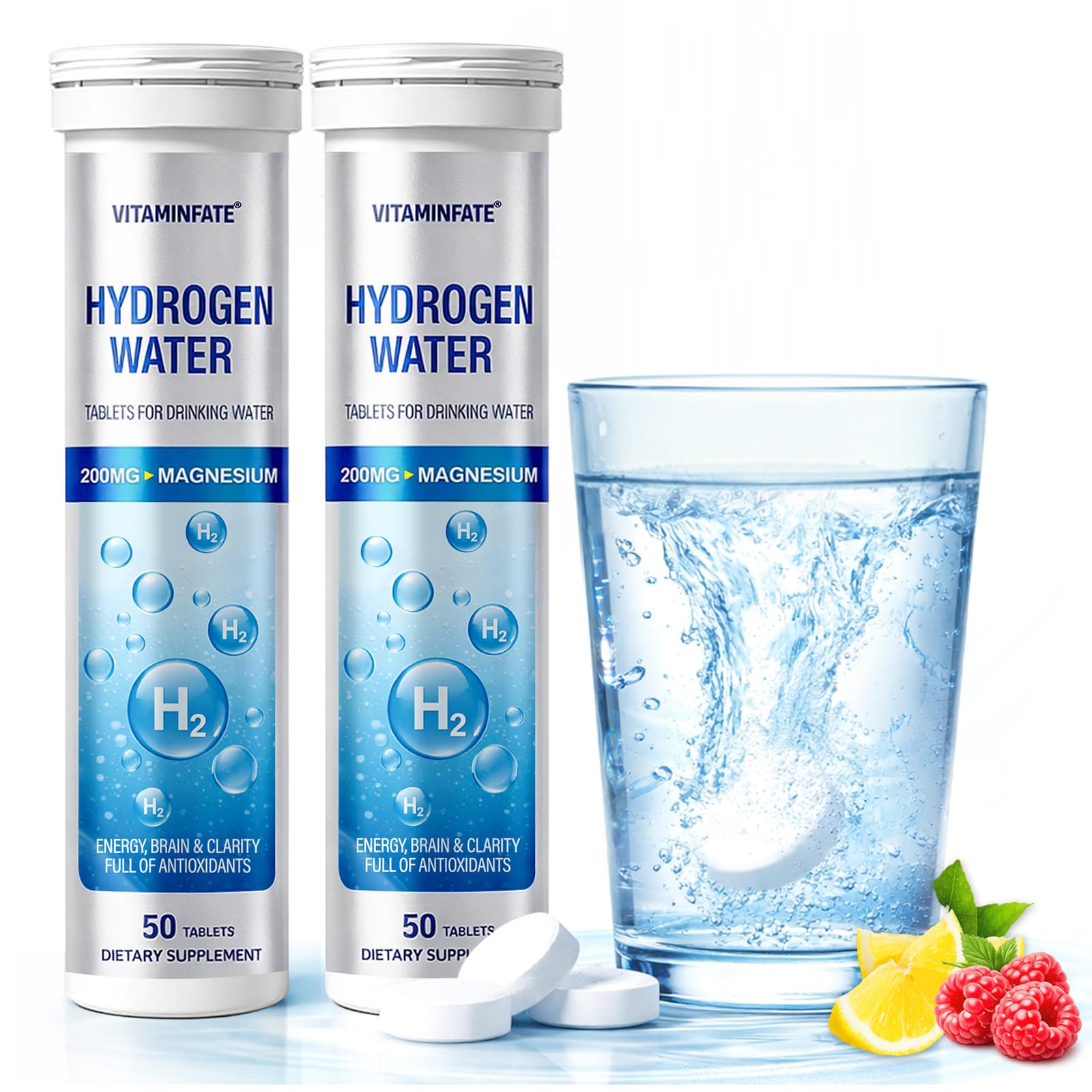 EFFORTLESS PREPARATION: Simply drop 2 tablets into 12-16 oz of warm water. Watch them dissolve fully in just 2 minutes, then enjoy. The perfect way to boost your hydration instantly, whether at home or on the go. SMART 2-PACK FOR BUSY LIFESTYLES – We know you are always on the move. That's why we provide two compact bottles (50 tablets each) instead of one bulky jar. Leave one at your office desk and keep the other in your kitchen or purse. Fresh wellness, wherever you are. DELICIOUS LEMON RASPBERRY FLAVORS – Say goodbye to the bad taste of traditional supplements. We use premium fruit extracts to create a light, crisp flavor profile. No sugar, no calories, just pure refreshing taste that makes healthy hydration a treat, not a chore. BANISH THE AFTERNOON SLUMP – Feeling tired by 2 PM? Instead of reaching for another coffee, revitalize your body with the power of hydrogen. Our magnesium-infused formula helps combat fatigue, clears "brain fog," and provides a steady stream of natural vitality to keep you productive. TRANSFORM YOUR TAP WATER – Turn plain, boring water into a delicious, health-boosting elixir. Simply drop one tablet into your glass, watch it fizz, and enjoy a refreshing antioxidant drink. The perfect way to get the whole family to drink more water and stay hydrated all day long.