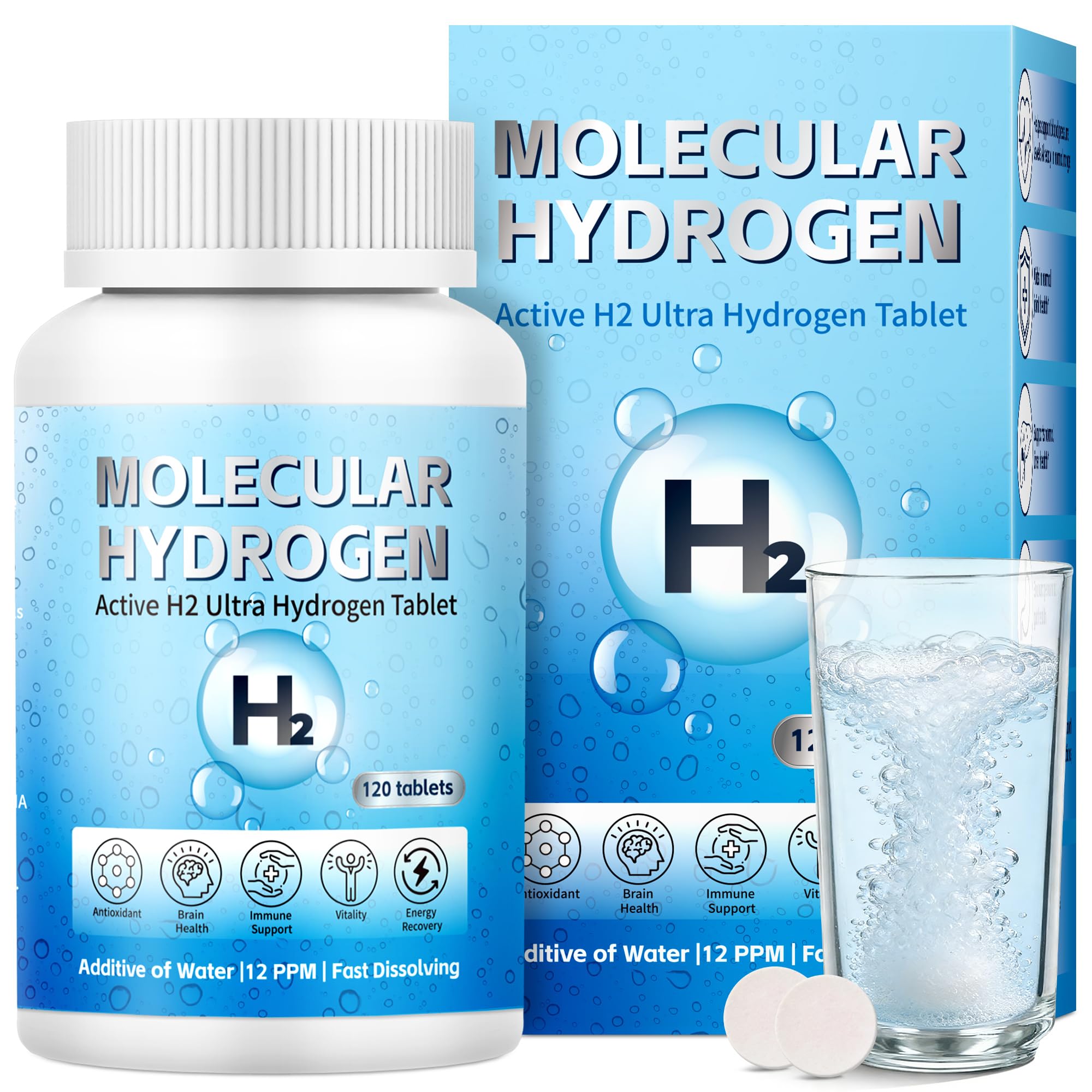 Hydrogen Water Tablets with Magnesium - 12 PPM H2 Molecular Hydrogen Tablets for Drinking Water Fast-Dissolving Antioxidant Support for Cellular Vitality Energy Recovery Non-GMO 120 Count