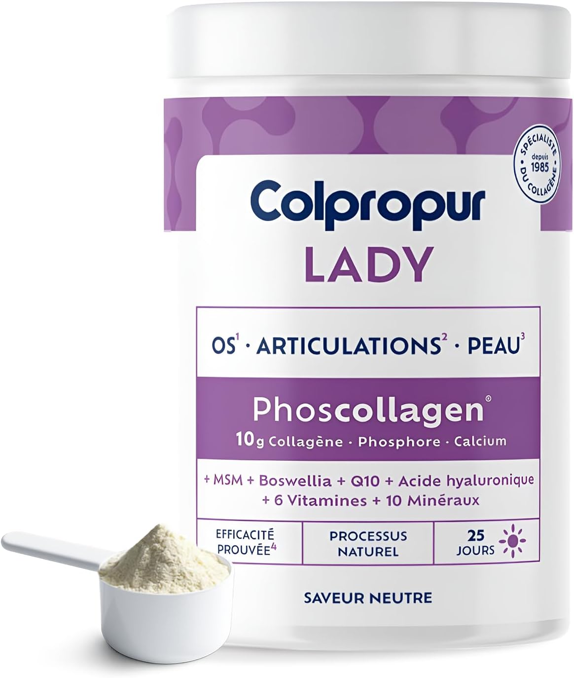 Women's health care. COLPROPUR LADY is a food supplement which, thanks to the properties of its ingredients, contributes to the well-being of: OS. Protein, calcium, phosphorus, magnesium, manganese, zinc and vitamins D and K contribute to the maintenance of normal structure. Vitamin C contributes to the normal formation of collagen to ensure the normal functioning of bones. Calcium, phosphorus and magnesium contribute to the maintenance of normal teeth. Items. Boswellia contributes to joint function and the contrast of localized states of tension. Vitamin C contributes to the normal formation of collagen to ensure the normal functioning of cartilage. Skin Vitamins B2, B3 and B8, iodine and zinc help maintain normal skin. Zinc and selenium help maintain normal hair and nails. Anti-aging and anti-fatigue effect. Zinc, selenium, copper, manganese and vitamins C and B2 help protect cells from oxidative stress. Iron, magnesium and vitamins C, B2, B3 help reduce fatigue. PHOSCOLLAGEN is an assimilable compound naturally formed from collagen, calcium and phosphorus. INGREDIENTS For a dose of 13.1 g - 40Kcal Fats 0 g Carbohydrate 0.1 g Proteins (N x 6.25) 10 g Hydrolyzed collagen 10 g Salt 0.15 g Calcium 600 mg Phosphorus 280 mg Magnesium 150 mg Silicon 10 mg Iron 5.6 mg Zinc 4 mg Manganese 0.8 mg Copper 0.4 mg Iodine 60 µg Selenium 22 µg Vitamin C 32 mg Vitamin B3 (Niacin) 6.4 mg Vitamin B2 0.56 mg Vitamin K (Phytomenadione) 30 µg Vitamin B8 (Biotin) 20 µg Vitamin D3 (Cholecalciferol) 10 µg MSM 100 mg Boswellia extract 50 mg Hyaluronic Acid 25 mg Coenzyme Q10 12 mg DIRECTIONS FOR USE We advise you to take 10 g of hydrolyzed collagen at breakfast dissolved in any liquid or fluid food (animal or vegetable milk, smoothie, yogurt, tea, infusion, juice, etc.). Requires a minimum of 3 months to feel the effects. SAFETY WARNING Not suitable for phenylketonurics or those intolerant to any of the ingredients. Not suitable for people suffering from hyperthyroidism or blood coagulation problems (presence of iodine and vitamin K), please seek advice from your doctor before consuming the product. People who require a protein-restricted diet (very serious kidney or liver failure) should take this product under medical supervision. Food supplements cannot replace a varied and balanced diet and a healthy lifestyle. Do not exceed the expressly recommended dose. The product should be kept out of the reach of young children. If you are pregnant, breastfeeding, taking medication, or have a serious illness, consult your doctor before taking this product. ✓ OUR COMMITMENT TO PURE COLLAGEN: Formulated to meet everyone's needs, Colpropur collagen is guaranteed fat and sugar free. Made without GMOs and allergens, our product is suitable for celiacs and is compatible with all other drug treatments. ? A RANGE DESIGNED FOR YOUR WELL-BEING AND BEAUTY: In addition to the action of BOVINE collagen, the LADY range provides real help in fighting joint pain thanks in particular to Boswellia and MSM, 2 natural active ingredients with an anti-inflammatory and analgesic effect. WHY TAKE COLLAGEN? The most abundant protein in our body, collagen is present in most of our tissues such as skin, joints, muscles, teeth, gums and bones. With age, the production of this collagen decreases, which can cause chronic health problems such as joint pain, bone decalcification, skin aging, etc. 10G OF COLLAGEN PER DAY A DOSE VALIDATED BY SCIENTIFIC STUDIES! This is the dose provided by a daily spoonful of Colpropur powder to help our body synthesize and produce its own collagen. Thanks to this necessary and effective intake of 10g per day, hydrolyzed collagen helps fill and strengthen weakened tissues, with first visible results after 3 months of taking it. ? WE TAKE CARE OF YOU DURING MENOPAUSE: Intended for pre-menopausal and menopausal women, the LADY range of COLPROPUR collagen offers real support to your body, especially your bones. Indeed, thanks to our latest innovation, Phoscollagen, we stimulate bone formation using a collagen phosphorus calcium complex which will help the bone to strengthen. Soins de santé des femmes. COLPROPUR LADY est un complément alimentaire qui, grâce aux propriétés de ses ingrédients, contribue au bien-être de : OS. Les protéines, le calcium, le phosphore, le magnésium, le manganèse, le zinc et les vitamines D et K contribuent au maintien d'une structure normale. La vitamine C contribue à la formation normale de collagène pour assurer le fonctionnement normal des os. Le calcium, le phosphore et le magnésium contribuent au maintien de dents normales. Articles. Le Boswellia contribue à la fonction conjointe et au contraste des états de tension localisés. La vitamine C contribue à la formation normale de collagène pour assurer le fonctionnement normal du cartilage. Peau Les vitamines B2, B3 et B8, l'iode et le zinc aident à maintenir une peau normale. Le zinc et le sélénium aident à maintenir des cheveux et des ongles normaux. Effet anti-âge et anti-fatigue. Le zinc, le sélénium, le cuivre, le manganèse et les vitamines C et B2 contribuent à protéger les cellules du stress oxydatif. Le fer, le magnésium et les vitamines C, B2, B3 contribuent à réduire la fatigue. Le PHOSCOLLAGÈNE est un composé assimilable formé naturellement de collagène, de calcium et de phosphore. INGRÉDIENTS Pour une dose de 13,1 g - 40Kcal Graisses 0 g Hydrate de carbone 0,1 g Protéines (N x 6.25) 10 g Collagène hydrolysé 10 g Sel 0,15 g Calcium 600 mg Phosphore 280 mg Magnésium 150 mg Silicium 10 mg Fer 5,6 mg Zinc 4 mg Manganèse 0,8 mg Cuivre 0,4 mg Iode 60 µg Sélénium 22 µg Vitamine C 32 mg Vitamine B3 (Niacine) 6,4 mg Vitamine B2 0,56 mg Vitamine K (Phytoménadione) 30 µg Vitamine B8 (Biotine) 20 µg Vitamine D3 (Cholécalciférol) 10 µg MSM 100 mg Extrait de Boswellia 50 mg Acide Hyaluronique 25 mg Coenzyme Q10 12 mg MODE D'EMPLOI Nous vous conseillons de prendre 10 g de collagène hydro
