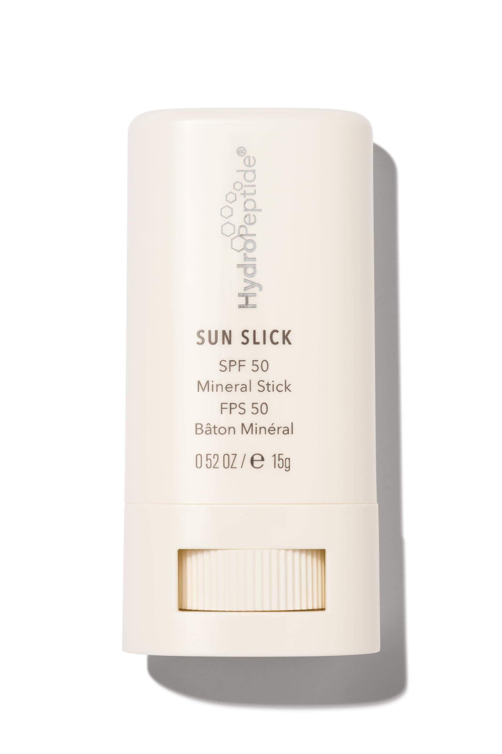 Preferred by professionals backed by epigenetic research. Experts in skin aging. HydroPeptide is developed by geneticists powered by patented peptide technology. We improve skin's function at the cellular level for results beyond the surface. Clinically clean, vegan cruelty-free ingredients. Peptides replenish hydration without feeling heavy, leaving you with a smoother more youthful complexion and help to reduce the appearance of sun damage effects, diminish fine lines, leaving you with a smoother more youthful complexion. Glow on the go with this portable mineral sunscreen SPF50 stick that offers both sunscreen and a subtle, radiant sheen. With a convenient, non-mess application. For all skin types. Enriched with sun-healing reparative peptides, hydrating lipids, and SPF-boosting ingredients, this is your ultimate summer companion for healthy, SPF skin protection. Convenient, mess-free format designed for frequent reapplication. Helps to protect against free radical damage that leads to fine lines and wrinkles. Portable Sun Protection with a Luminous Twist. Sun Slick SPF50 features patented non-nano zinc oxide technology for even effective sun protection. Provides a subtle, radiant sheen and satiny feel.