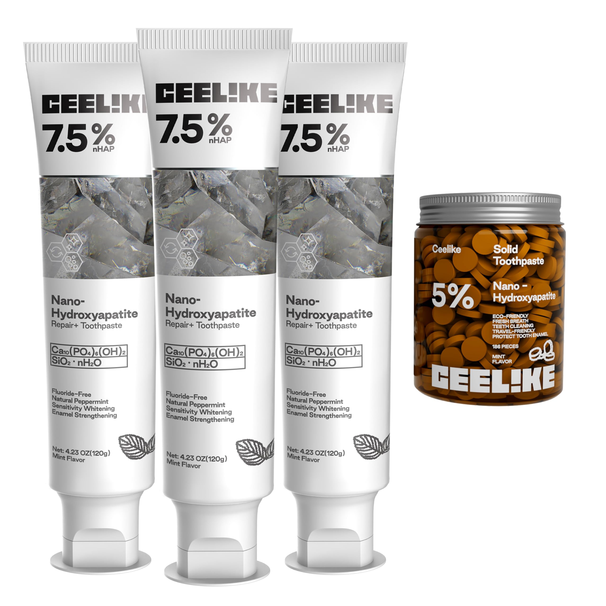 Experience a natural way to care for your smile with CEELIKE's complete toothpaste set. Featuring 3 tubes of hydroxyapatite toothpaste and 186 toothpaste tablets, this fluoride-free oral care bundle helps strengthen teeth, support enamel repair, and freshen breath—without harsh chemicals. Ideal for both home and travel use, CEELIKE keeps your mouth clean, your breath fresh, and your confidence high.