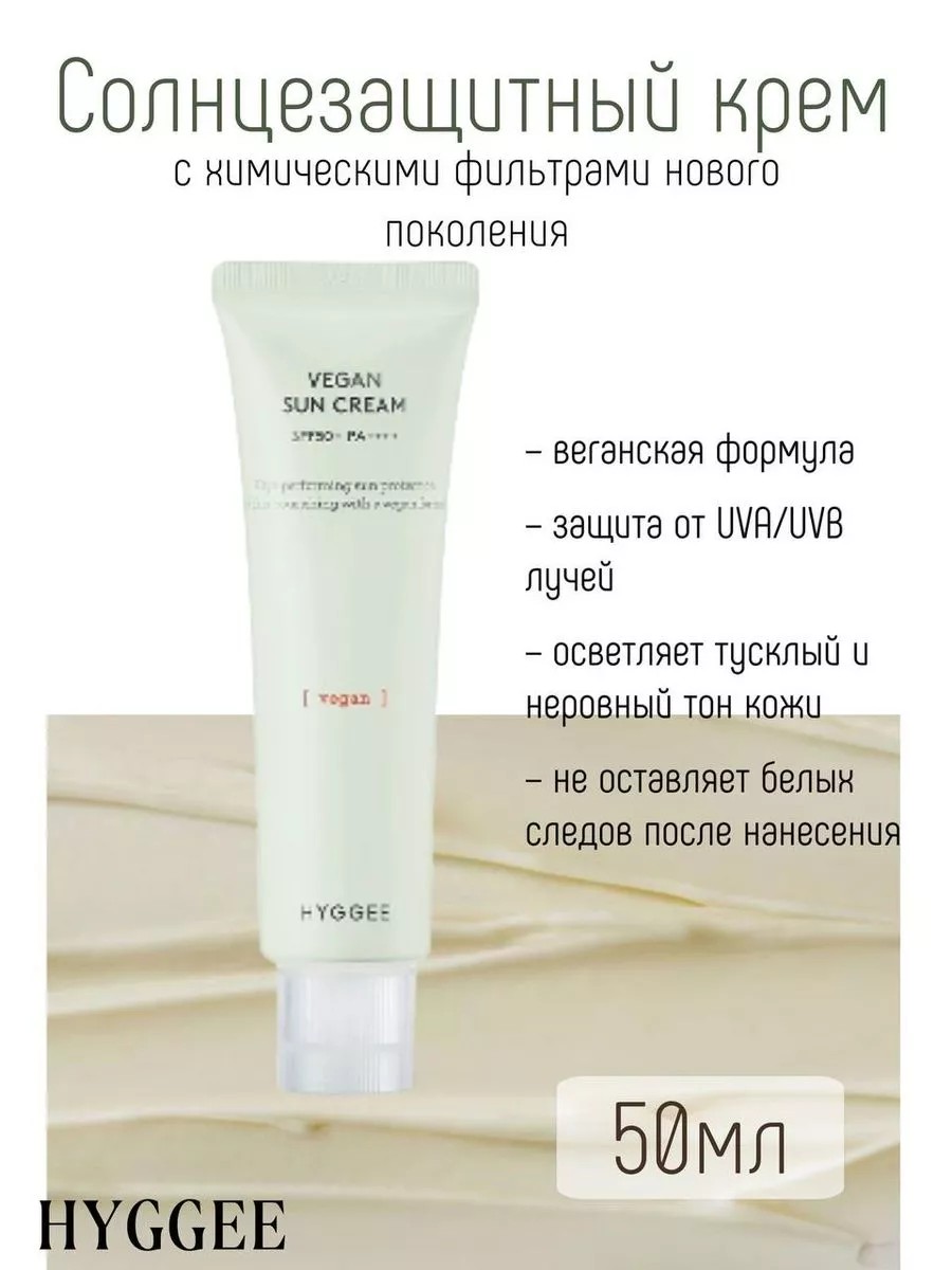 Hyggee Vegan Sun Cream SPF50 + PA ++++ – Солнцезащитный крем с 5 типами химических фильтров обеспечивает высокую защиту от лучей UVA и UVB. Этот лёгкий крем увлажняет кожу и быстро впитывается, не оставляя белых следов.