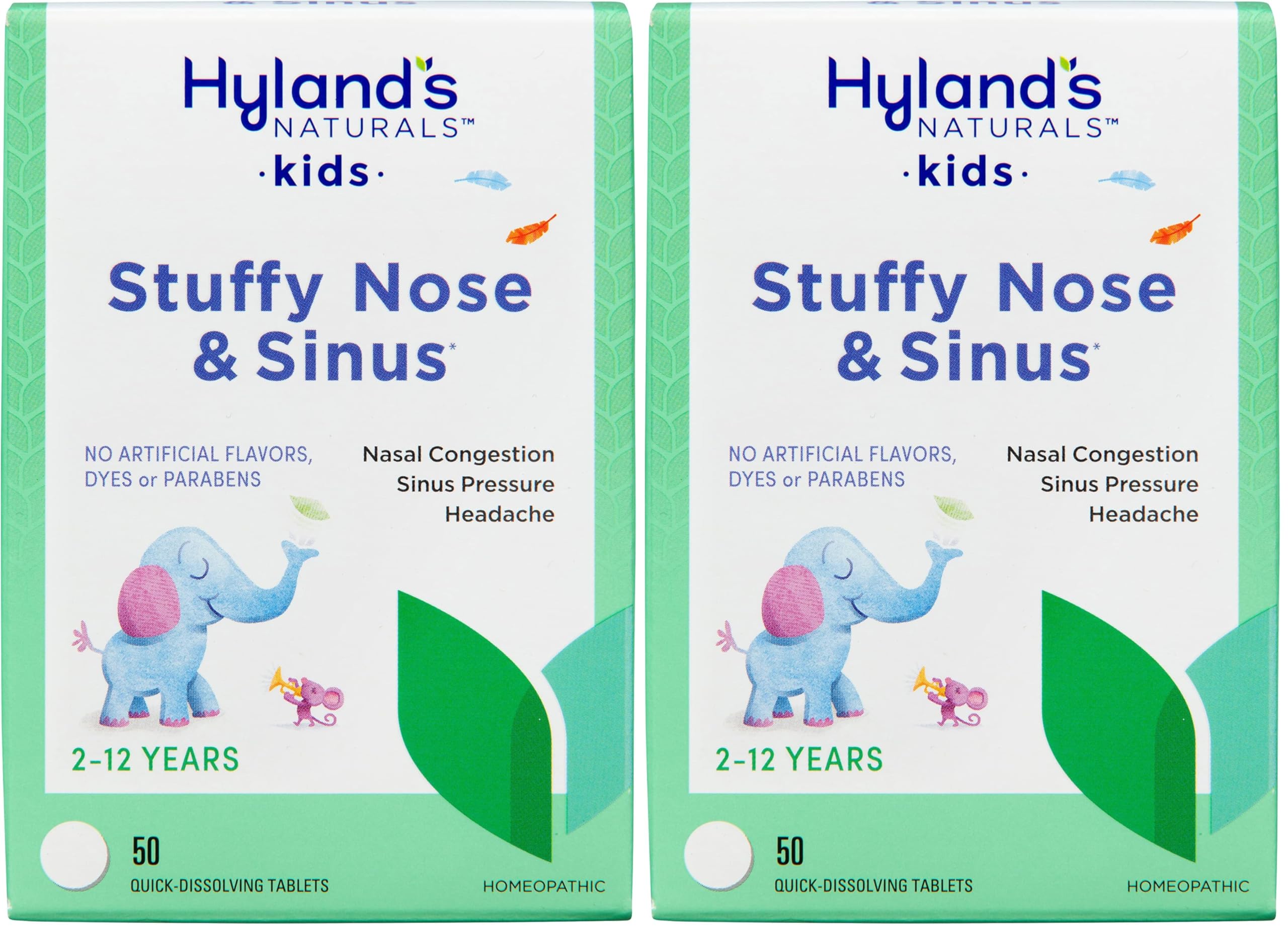 Hyland's Naturals Kids Stuffy Nose and Sinus Tablets Cold and Allergy Medicine for Children Ages 2 and up Headache Relief and Nasal Decongestant Quick Dissolving Tablets 50 Count (Pack of 2)