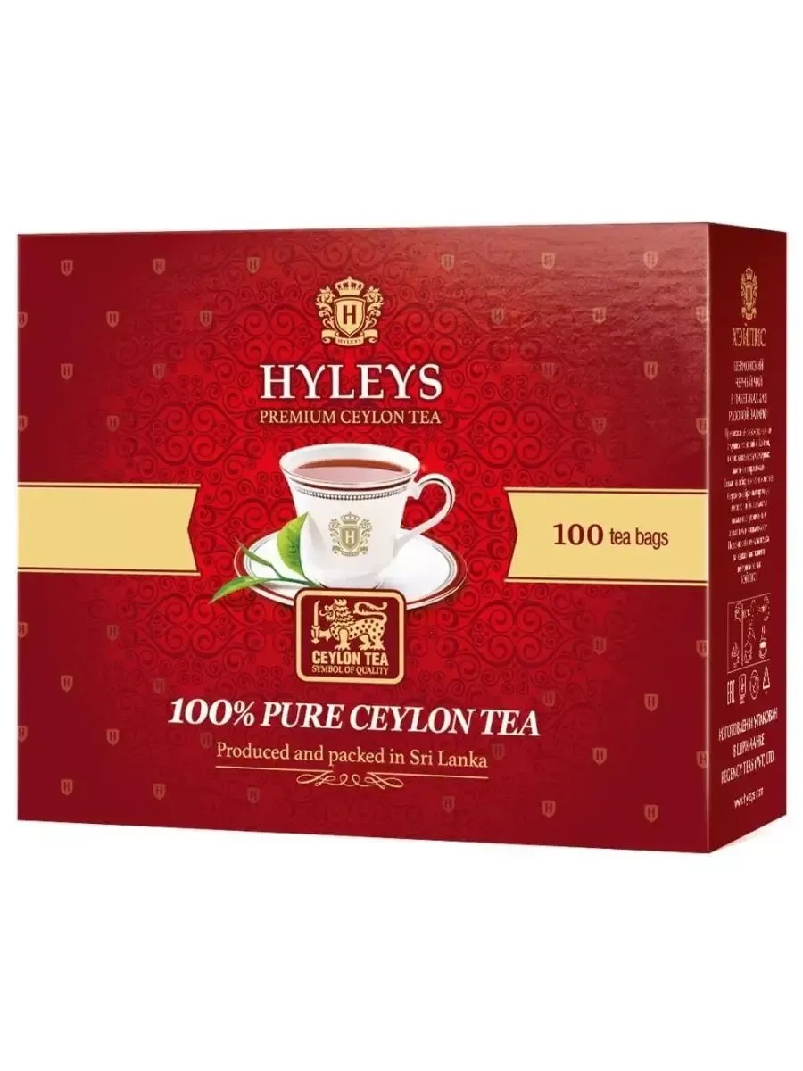 Hyleys Black Tea, Ceylon, 100 bags of 2 grams each. Ceylon is a magnificent black tea, carefully hand-picked from the best plantations and selected for you by our experts. A cup of invigorating tea will improve your mood, increase vitality, and restore your energy throughout the day.