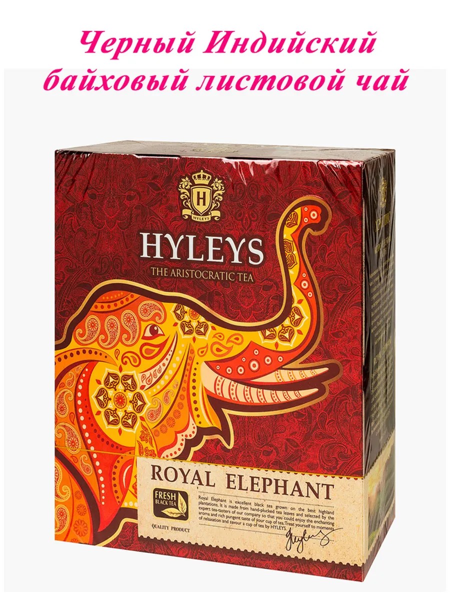 Чай Hyleys черный Королевский слон 200 г – высококачественный напиток в классическом рассыпном формате. В упаковке привлекательного дизайна находится герметичный мягкий пакет с чайным листом индийского происхождения.