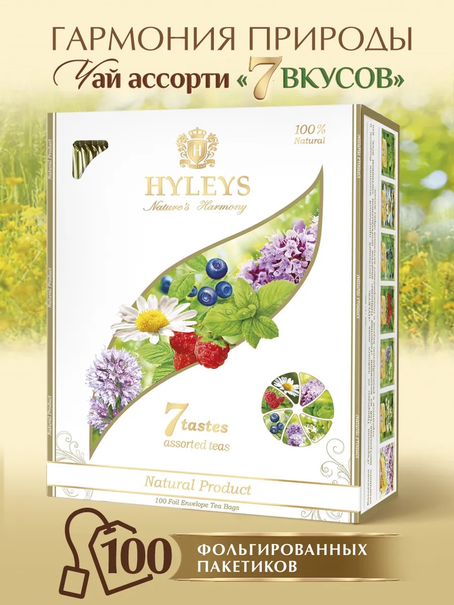 В пачке «7 вкусов» собраны ключевые чаи коллекции «Гармония Природы»: Стремясь удовлетворить растущий интерес образу жизни и натуральным продуктам, ХЭЙЛИС создал набор «Ассорти 7 вкусов» в более доступной упаковке 100пак