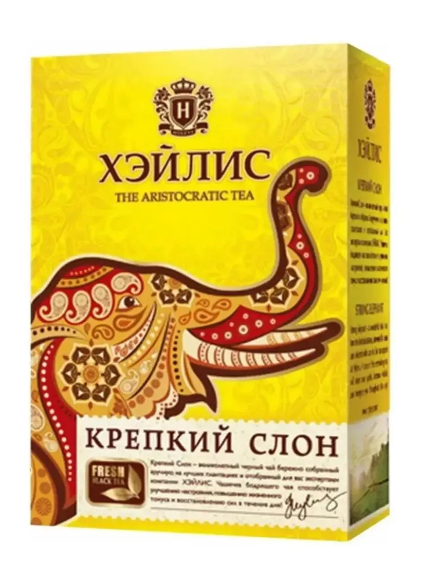 Чай Hyleys Крепкий Слон 200 г, черный лист. Чай Hyleys Крепкий слон — превосходный черный чай с лучших плантаций. Создан из чайных листьев бережно собранных вручную и отобранных ти-тестерами компании для того, чтобы Вы смогли насладиться чарующим ароматом и насыщенным терпким вкусом. Чашечка бодрящего чая способствует улучшению настроения, повышению жизненного тонуса и восстановлению сил в течение дня! Способ приготовления: Заварить крутым кипятком чайные листья из расчета 1 чайная ложка на 1 порцию напитка. Выдержать 2-3 минуты. Желательно использовать фильтрованную воду.Хранить в прохладном сухом месте без посторонних запахов при относительной влажности воздуха не более 70%. Не подвергать воздействию прямого солнечного света.