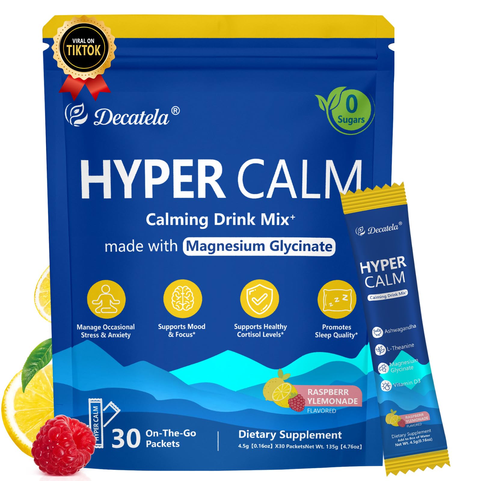 Decatela HyperCalm Super Cortisol Drink? Where Science Meets Serenity In a world that never slows down, Decatela created HyperCalm – a clinically crafted cortisol-balancing drink designed to help you reclaim calm without compromising energy. Our formula blends adaptogenic herbs and time-tested nutrients to support your body's natural stress response, so you can face challenges with clarity and resilience. Why HyperCalm ? ?Science-Backed Ingredients? – Each sip delivers targeted support for cortisol balance and mental clarity. ? ?Clean Conscious? – Free from artificial additives, because purity matters. ? ?Designed for Real Life? – Whether it's a demanding day or a restless night, HyperCalm adapts to your needs. At Decatela, we believe true wellness isn't about escaping stress—it's about mastering it. HyperCalm is your daily ally in finding balance, naturally. Because calm should be effortless, not elusive.ON-THE-GO :Each stick pack is perfectly portioned for ease and portability, Pre-measured packets blend instantly into water, juice, or smoothies. Vegan, gluten-free, and allergen-friendly—your effortless calm companion for home, travel, or demanding days. PURE, TRANSFORMATIVE NUTRITION :HyperCalm powder, 100 clean ingredients, fully traceable: NO sugar, fillers, GMOs, or artificial additives. Powered by adaptogens and essential vitamins (like D3) to sharpen focus, and nourish mind-body wellness—without compromising on bold, natural flavor. Hormone Balance Support for Middle-Aged Women :Women ages 30–49 going through perimenopause may experience hormonal fluctuations that cause low mood, nighttime restlessness, and waking up in the middle of the night. After drinking it, high cortisol levels are soothed, reducing heart flutters and hot flashes so you can sleep through the night and wake up without irritability. Stress Relief for Working Women :If you're an office worker dealing with heavy work stress, anxiety, and elevated cortisol that disrupt your sleep, take it before bed to relieve the tension built up throughout the day. It helps your mind shut down and relax, addressing the struggle of not being able to unwind, restoring your energy and preventing next-day fatigue. Improved Sleep Experience for Women :You might be busy with work and taking care of kids every day, and your mind doesn't stop, making it hard to fall asleep. Drink a cup 30–120 minutes before bedtime to quickly calm your thoughts, help you break free from overthinking, and ease into deep sleep. Wake up refreshed and ready for a new day.