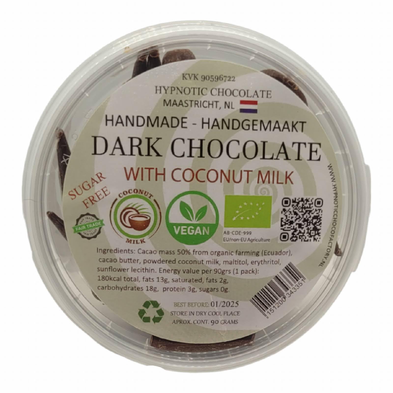 Chocolate obtained by manually disintegrating properly fermented and dried cacao beans, previously subjected to cleaning, shelling, and roasting, practically free of all kinds of impurities. The product undergoes a refining and tempering process, thus obtaining highly complex organoleptic characteristics. Ingredients: Organic coconut 50 , organic coconut milk powder (Ecuador), maltitol, erythritol, sunflower lecithin. SUGAR FREE. In recent years, dark chocolate has been praised as a healthy treat. Pure dark chocolate is rich in flavanols. Flavanols are antioxidants linked to a lower risk of heart disease and cancer. Raw cacao has a high flavanol content (greater health benefits). Milk chocolate contains much less. Dark chocolate is also a good source of soluble fiber, vitamins, and minerals (such as iron, zinc, magnesium, etc.). Plus, our pure dark chocolate options have no refined sugar. For the greatest "health benefit", select dark chocolate with the most amount of added sugar like our Hypnotic Chocolates. In this case, this one is Sugar Free! Vegan Handmade Super Food No Additives No Artificial Flavors Soy Free Dairy Free INGREDIENTS Raw cocoa mass (80 pure raw cocoa) coconut sgar and sunflower lecithin.Handcrafted Pure Chocolate with Coconut Milk 90 Grammes SUGAR FREE VEGAN CHOCOLAT (our own creation!)DESCRIPTION DU PRODUIT DESCRIPTION DU PRODUIT Chocolate obtained by manual disintegration of properly fermented and dried cacao beans, previously subjected to cleaning, shelling and roasting, practically free of all kinds of impurities. The product goes through a refining and tempering process, thus obtaining highly complex organoleptic characteristics. Ingrédients : noix de coco bio 50 , poudre de lait de noix de coco bio (Equateur), maltitol, érythritol, lécithine de tournesol. SUGAR FREE Dans des années récentes, le chocolat noir a été praised comme un traitement sain. Le chocolat noir pur est riche en flavanols. Les flavanols sont des antioxydants liés à un risque inférieur de maladie cardiaque et de cancer. Le cacao brut contient une teneur élevée en flavanol (meilleur bénéfice pour la santé). Milk Chocolate contains a lot less. Le chocolat noir est également une bonne source de fibre soluble, de vitamines et de minéraux (tels que l'iron, le zinc, le magnésium, etc.). Plus, our pure dark chocolate options have no refined sugar. For the greatest "health benefit", select dark chocolate with the most amount of added sugar like our Hypnotic Chocolates. Dans ce cas, this one is Sugar Free! Vegan Handmade Super Food No Additives No Artificial Flavours Soy Free Dairy Free INGRÉDIENTS Raw cocoa mass (80 cacao cru pur) sgar de noix de coco et lécithine de tournesol.