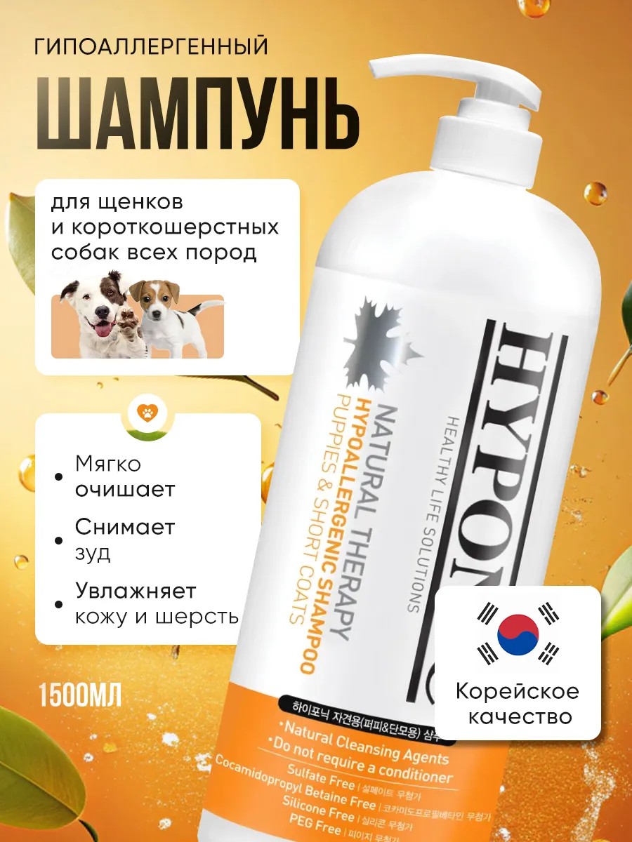 Гипоаллергенный шампунь HYPONIC для щенков и короткошерстных собак всех пороб специально разработан для мягкого очищения и дополнительного увлажнения кожи и шерсти. Этот нежный шампунь для щенят состоит из безопасных компонентов без агрессивных химических веществ. Он содержит современные деликатные ПАВ, которые эффективно справляются с загрязнениями, пантенол и растительные масла, которые дополнительно увлажняют нежную кожу и шерсть питомца. А также целый комплекс растительных экстрактов: