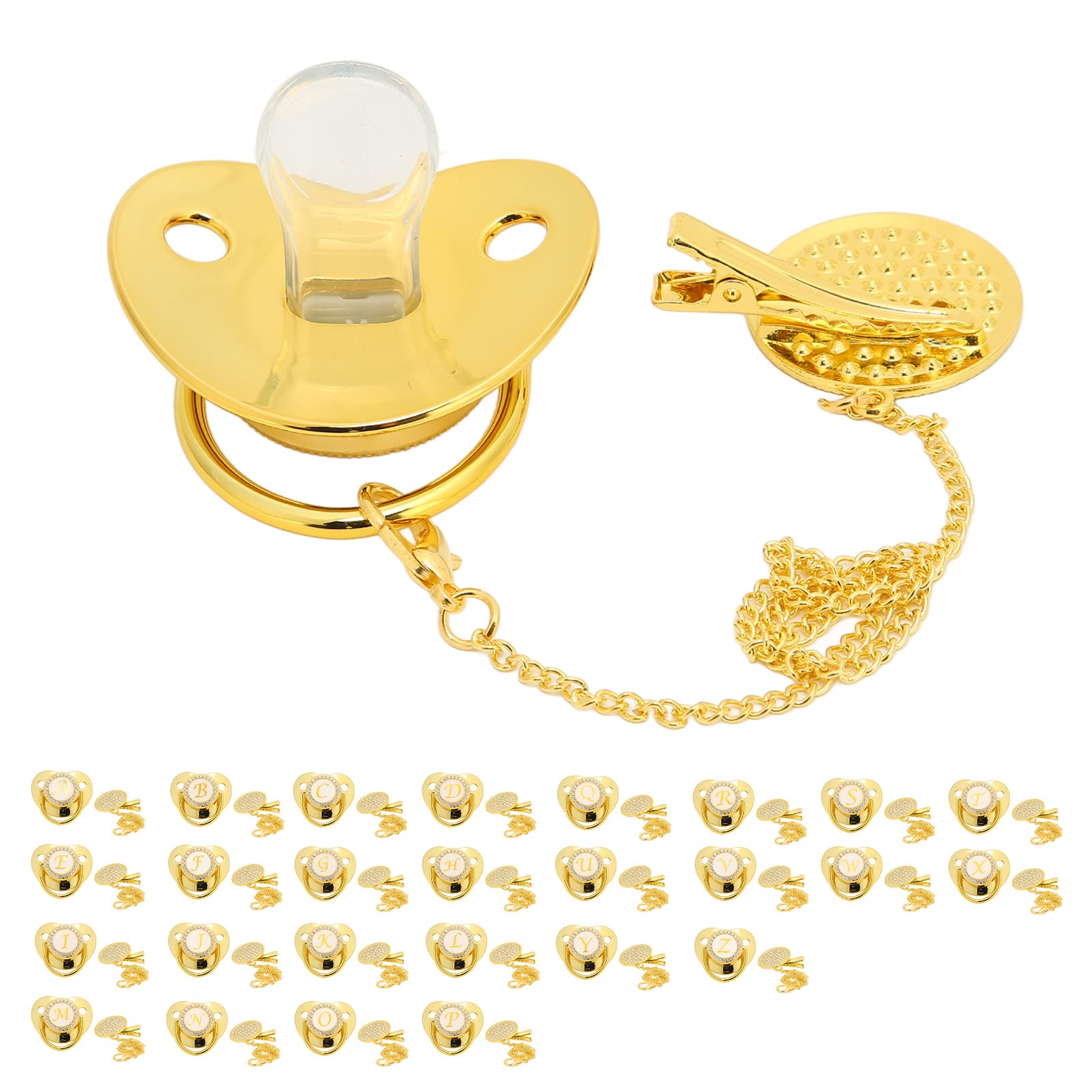 Specification: Article type: Golden baby pacifier Material of the pacifier section: PP, silicone Suitable age: for 6-18 months baby Package list: 1 x Golden baby pacifier 1 x clips26 bookstart: The cylindrical shape was developed with the support of pediatric nutrition experts and enables your baby to imitate the shape of his tongue when breastfeeding, which contributes to maintaining your tiring trip.make the oral development of the baby healthier and promote the natural development of the teeth and gums of the baby.Soft lightweight: The bling baby pacifier is ultra-light and flexible to reduce oral fatigue so that the baby can suck longer.It can also be used as a toy for children to play.Healthy and practical: The baby pacifier has a one-piece, seamless design that does not hide dirt and has no risk of swallowing.This handmade pacifier and clip set would be a great Christmas, Halloween and birthday present for newborns.Safety materials: Golden baby pacifier consists of silicone, PP and metal, BPA-free, safe, non-toxic, odorless, safe for babies.Used indoors outdoor area.Curved design: The golden pacifier with clip initials has a rounded design that is ergonomic and reduces the friction with the nose.Ideal for baby parts, baptisms, gender envelopes, parties, photo sessions and more.Spezifikation: Artikeltyp: Goldener Baby-Schnuller Material des Schnullerteils: PP, Silikon Geeignetes Alter: Für 6-18 Monate Baby Paketliste: 1 x goldener Baby-Schnuller 1 x Clips26 Buchstabendesign: Die zylindrische Form wurde mit Unterstützung von pädiatrischen Ernährungsexperten entwickelt und ermöglicht es Ihrem Baby, beim Stillen die Form seiner Zunge nachzuahmen, was dazu beiträgt, Ihre Stillreise zu erhalten. machen die orale Entwicklung des Babys gesünder und fördern die natürliche Entwicklung der Zähne und des Zahnfleisches des Babys. Weiches Leichtgewicht: Der Bling-Babyschnuller ist ultraleicht und flexibel, um die orale Ermüdung zu reduzieren, damit das Baby länger saugen kann. Es kann auch als Spielzeug für Kinder zum Spielen verwendet werden. Gesund und praktisch: Der Baby-Schnuller hat ein einteiliges, nahtloses Design, das keinen Schmutz verbirgt und keine Verschluckungsgefahr besteht. Dieses handgefertigte Schnuller- und Clip-Set wäre ein tolles Weihnachts-, Halloween- und Geburtstagsgeschenk für Neugeborene. Sicherheitsmaterialien: Goldener Babyschnuller besteht aus Silikon, PP und Metall, BPA-frei, sicher, ungiftig, geruchlos, sicher für Babys zu verwenden. Verwendet im Innen- Außenbereich. Gebogenes Design: Der goldene Schnuller mit Clip-Initialen hat ein abgerundetes Design, das ergonomisch ist und die Reibung mit der Nase verringert. Ideal für Babypartys, Taufen, Geschlechtsenthüllungen, Partys, Fotosessions und mehr.Hyuduo Goldener Baby-Schnuller, Personalisiertes Gebogenes Design, 26 Buchstaben, Sichere Materialien, Gesunder Bling-Baby-Schnuller, Neugeborenen-Essentials mit Clips für 6 Bis 18 Monate Baby(N)