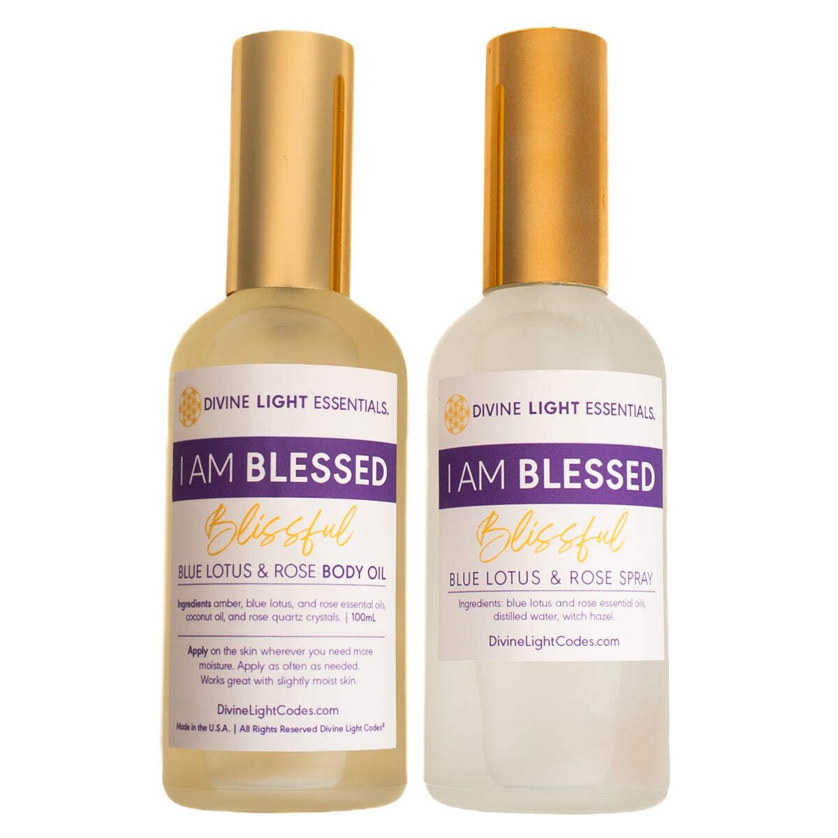 I Am Blessed Blissful Spray Body Oil Bundle supports feelings of self-love, emotional balance, and everyday relaxation. This thoughtfully created bundle combines a refreshing aura spray with a deeply nourishing body oil, designed to uplift your senses while caring for your skin. The blend features pure-grade blue lotus and rose essential oils, known for their calming, heart-centered aromas. The body oil is enhanced with amber to promote grounding and comfort, while both products are infused with rose quartz crystals to amplify loving and soothing intentions. Key Benefits Uses Apply (Body Oil): Massage onto arms, legs, shoulders, chest, or pulse points as part of your daily self-care routine. External use only. Spray: Mist into your personal space, around your aura, or onto linens to refresh your surroundings and uplift your mood. Affirmation: I Am BlessedIntentional Focus: Calm, blissful, heart-centered encourages relaxation, self-love, and emotional harmonyVisualize: Soft pink and gentle golden light surrounding you Crystals: Rose quartz crystals infused in both the spray and body oil Product Specifications Ingredients: Organic carrier oils, proprietary blend of pure essential oils including blue lotus and rose amber (body oil) rose quartz crystals Bundle Includes: 1 Aura Spray Bottle1 Body Oil BottleBottle Type: Glass bottles (spray and oil) Use: External use onlyPerfect for daily rituals, self-care moments, relaxation routines, or thoughtful gifting, the I Am Blessed Blissful Spray Body Oil Bundle offers a gentle reminder to slow down, reconnect, and embrace moments of peace and positivity.Ingredients: Organic carrier oils, proprietary blend of pure essential oils including blue lotus and rose amber (body oil) rose quartz crystalsPerfect Ritual or Gift – Ideal for meditation, self-care, intention-setting, aura clearing, or gifting to someone who needs love and blessings. Nourishes Hydrates Skin – Organic coconut oil softens, smooths, and leaves skin radiant while enveloping senses in blissful aromas. Grounding Soothing – Amber essential oil balances mind and body, promoting calm, clarity, and centered energy. Heart-Opening Uplifting – Infused with blue lotus, rose essential oils, and rose quartz crystals to enhance emotional healing and divine blessings. Double Dose of Bliss – Includes both the I Am Blessed Spray and Blissful Body Oil for full-spectrum self-love and spiritual elevation.
