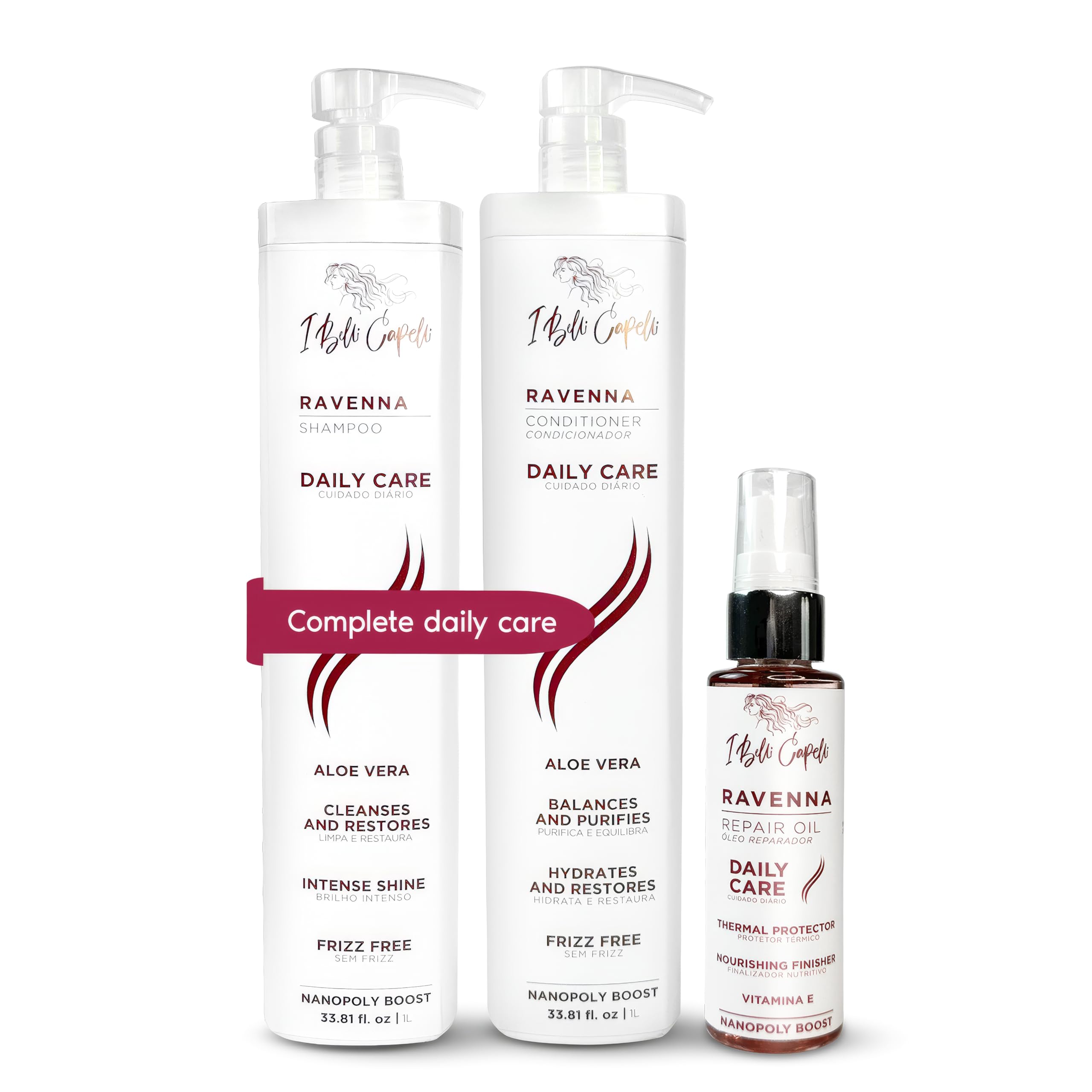 Ideal for all hair types: Perfect for dry, damaged, color-treated, or chemically processed hair that needs hydration, repair, and protection. Repairs split ends: The repairing oil targets and heals split ends, sealing the hair cuticle for a healthy, groomed appearance. Smoothes and tames frizz: The conditioner smooths hair, eliminates frizz, and leaves it silky and manageable. Strengthens and prevents breakage: The shampoo and conditioner work together to fortify hair from root to tip, reducing breakage and preventing split ends. Deep hydration and nourishment: Infused with Aloe Vera, this trio provides intense hydration, leaving your hair soft, shiny, and moisturized.Idéal pour tous les types de cheveux : Parfait pour les cheveux secs, abîmés, colorés ou traités chimiquement qui ont besoin d'hydratation, de réparation et de protection. Réparation des pointes fourchues : L'huile réparatrice cible et soigne les pointes fourchues, en scellant la cuticule du cheveu pour une apparence saine et soignée. Lisse et maîtrise les frisottis : L'après-shampooing lisse les cheveux, élimine les frisottis et les rend soyeux et faciles à coiffer. Renforce et prévient la casse des cheveux : Le shampooing et l'après-shampooing agissent ensemble pour fortifier les cheveux de la racine à la pointe, en réduisant la chute des cheveux et en prévenant les cassures. Hydratation et nutrition en profondeur : Infusé d'Aloe Vera, ce trio procure une hydratation intense, laissant vos cheveux doux, brillants et hydratés.I Belli Capelli Ravenna Daily Care Kit Shampooing, Après-Shampooing Huile Réparatrice à l'Aloe Vera – Hydratation Force pour des Cheveux Sains