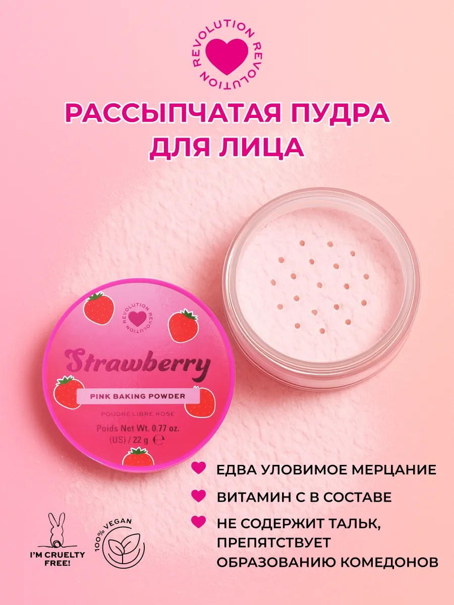 Доведите макияж до совершенства с Strawberry Pink Baking Powder! Эта лёгкая рассыпчатая пудра с ультратонким покрытием станет вашим сладким секретом стойкого макияжа. Подходит для всех типов кожи. Пудра для бейкинга с эффектом фотошопа не только увеличивают стойкость макияжа, устраняет блеск и высветляют тон кожи — она еще и ароматизирована! Выбирайте: кокос, клубника банан или персик.