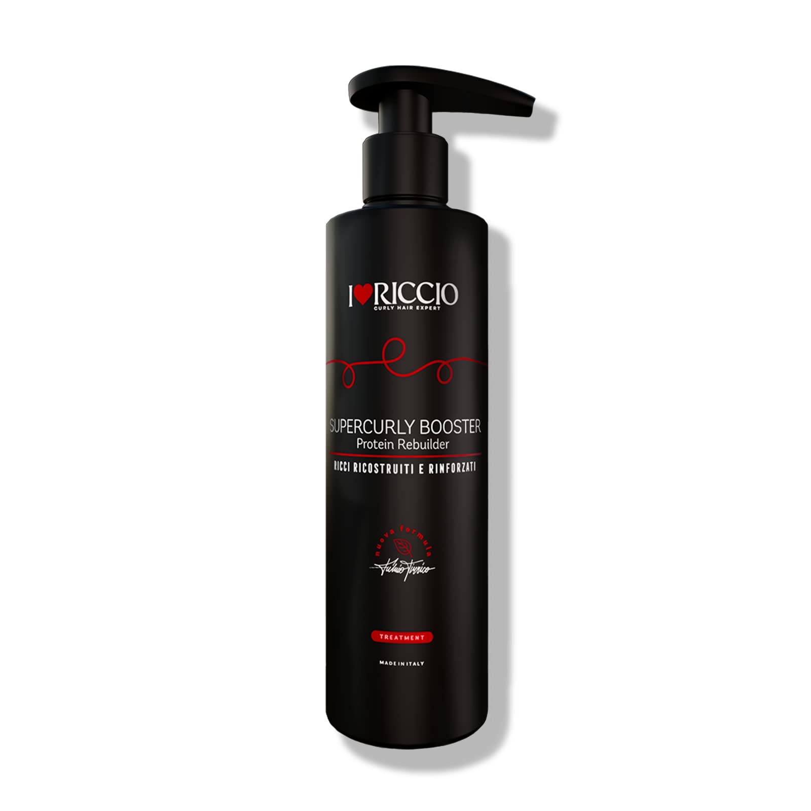 I LOVE RICCIO: Let yourself be guided by real curl professionals and achieve unique and personal results in terms of volume, length, mass, definition or softness. Use: apply the product to washed and towel-dried hair and distribute it with your hands from roots to ends. Leave on for 30-45 minutes, rinse and apply the moisture mask. Suitable for: wavy and bleached hair, bleached, dyed, have lost moisture and nourishment, body and volume that is dull, breaking and difficult to grow. Properties: keratin nourishes and moisturizes the hair, collagen fills and strengthens the hair fiber, quite special proteins that form a protective film on the hair surface. Supercurly Booster: protein reconstructor based on keratin and hydrolyzed collagen, ideal for wavy and curly hair that is chemically damaged by bleaching or heat from the hair straightener.I Love Supercurly Booster, eiwitopbouw voor gebleekt, krullend of golvend haar, geeft sterkte, structuur, volume en definitie, 200 mlI LOVE RICCIO: laat je leiden door echte krulprofessionals en bereik unieke en persoonlijke resultaten op het gebied van volume, lengte, massa, definitie of zachtheid. Gebruik: breng het product aan op gewassen en goed handdoekdroog haar en verdeel het met je handen van de wortels tot de punten. 30-45 minuten laten inwerken, afspoelen en het vochtmasker aanbrengen. Geschikt voor: golvend en gebleekt haar, gebleekt, geverfd, vocht en voeding hebben verloren, lichaam en volume dat dof is, breken en moeilijk te groeien. Eigenschappen: keratine voedt en hydrateert het haar, collageen vult de haarvezel op en versterkt deze, vrij speciale eiwitten die een beschermende film op het haaroppervlak vormen. Supercurly Booster: proteïne-reconstructor op basis van keratine en gehydrolyseerd collageen, ideaal voor golvend en krullend haar, dat door bleken of hitte van de stijltang chemisch beschadigd wordt.