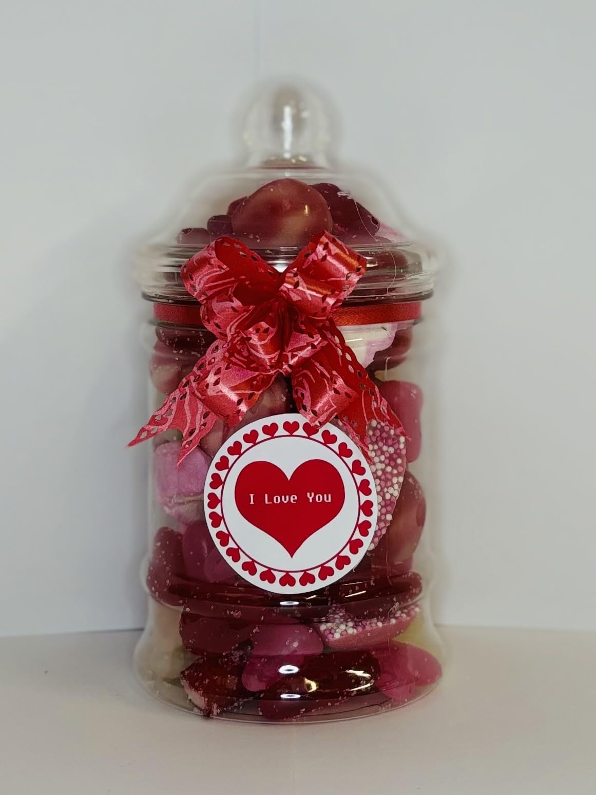 Will be loved by all ages. Filled with delicious pink red Love sweets. Pick n Mix style sweet jar. Happy Valentines Day.
