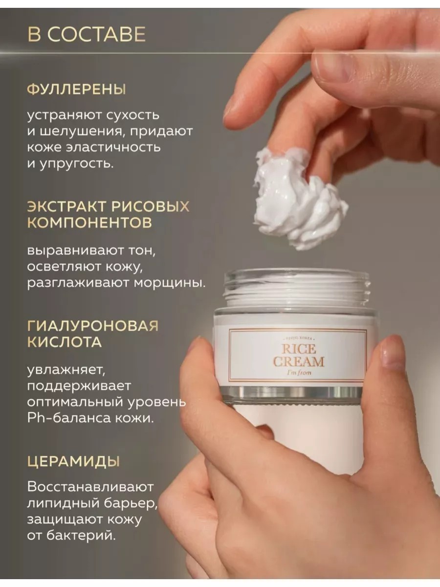I'm From Крем питательный смягчающий с экстрактом риса - Rice cream, 50г. Питательный смягчающий крем с экстрактом риса I'm From Rice Cream делает кожу нежной и бархатистой, моментально насыщает клетки влагой, устраняет сухость и стянутость. Выравнивает тон кожи, успокаивает, снимает тусклость и покраснения, разглаживает рельеф. Содержит 41% рисовой воды, керамид NP и масло ши. Способ применения: нанесите небольшое количество крема в качестве завершающего этапа ухода. Подходит для всех типов кожи.