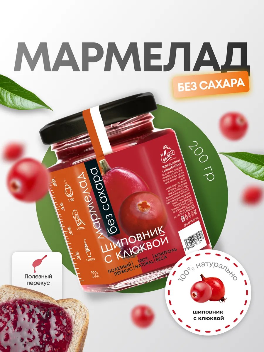 Мармелад джем шиповник и клюква без сахара 200г