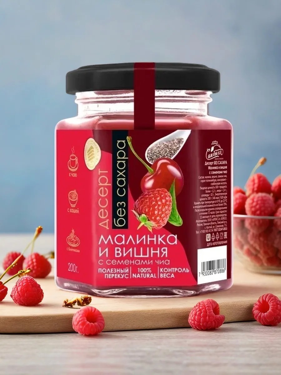 Десерт - джем без сахара малина и вишня с семенами чиа от компании «Сам бы ел» - это необычайно вкусный продукт, который украсит любое чаепитие, а так же станет прекрасной начинкой для выпечки и добавкой к любимым блюдам.