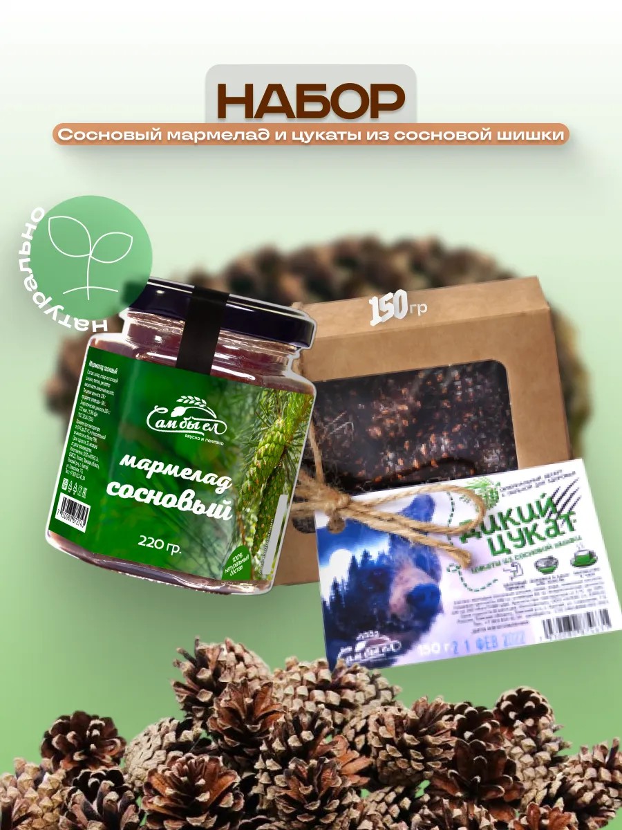 Погрузитесь в мир натуральных сладостей с нашим эксклюзивным набором, который включает в себя два уникальных продукта: Мармелад Сосновый (220 г) и Цукаты из шишки (150 г). Это идеальная композиция для истинных ценителей природы и здорового питания!