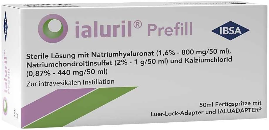 Ingredients: 50 ml of instillate (1 instillation) contains: hyaluronic acid, sodium salt 800 mgchondroitinsulfate-sodium-salt mixture 1000 mgcalcium chloride 440 mgsonstiger component: water for injection purposes Ialuril Prefill can be administered in two species - either via a catheter or with the ialuadapter , which is included in the package.The administration with the adapter is simple, gentle and painless.Treatment is carried out by medical specialist staff.After the necessary instruction and in consultation with your doctor, you can also carry out the treatment at home.at. Ingredients ingredients 50 ml of instillate (1 instillation) contains: hyaluronic acid, sodium salt 800 MGChondroitin sulfate-salze mixture 1000 mgcalcium chloride 440 mgsonstiger component: water for injection purposes Instructions Ialuril Prefill can be administered in two species - either via a catheter or with the ialuadapter , which is included in the package.The administration with the adapter is simple, gentle and painless.The treatment is carried out by medical specialist staff More