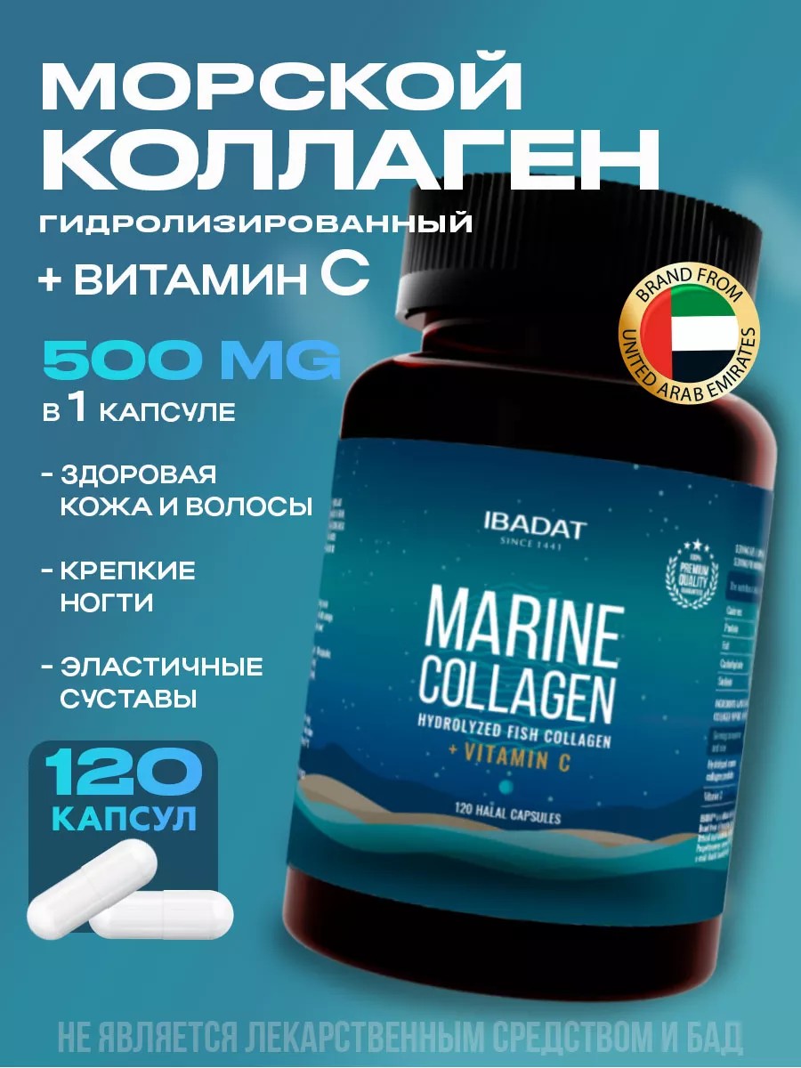 IBADAT - международный зарегистрированный бренд, выпускающий пищевые добавки, мёд, масла и многое другое, основанный в Москве и на данный момент функционирующий в ОАЭ. Коллаген необходим нашему организму для поддержания здоровья волос, костей, ногтей, кожи и т.д. Специально разработанный морской коллаген отличается лучшей усвояемостью и быстродействием. Морской коллаген в капсулах способствует увеличению синтеза собственного коллагена. Морской гидролизованный коллаген укрепляет волосы и улучшает эластичность кожи. Проконсультируйтесь с врачом перед использованием данного продукта, если вы принимаете лекарства или страдаете какими-либо заболеваниями. Без глютена, лактозы, сои, консервантов, подсластителей, искусственных ароматизаторов или красителей. Коллаген в капсулах, колаген с витамином с, collagen. Принимать коллаген нужно вместе с витамином C, который уже идет в составе. Поэтому никакие другие добавки вам не нужны. Морской коллаген в капсулах - Marine Collagen, гиалуроновая кислота и витамин C влияют на здоровье опорно-двигательной системы. Морской коллаген в капсулах - основной структурный белок, который содержится в тканях и органах тела и обеспечивает ключевые процессы жизнедеятельности внутри и снаружи организма. Морской коллаген в капсулах для лица и тела поддерживает красоту, улучшает структуру волос и ногтей. Витамин С в составе увеличивает эффективность и способствует синтезу собственного коллагена в организме. Укрепляет костную ткань, ускоряет восстановление, снижает риск развития переломов и остеопороза. Морской коллаген максимально эффективно усваивается и выступает основным типом коллагена в организме человека, а значит, вероятность аллергической реакции исключена. Помимо этого, именно морской коллаген глубоко увлажняет кожу, разглаживает морщины лица, улучшает рост волос и ногтей, действуя как хондропротекторы (глюкозамин и хондроитин) участвует в регенерации суставов, сосудов, хрящей и связок. Он отлично дополняет спортивное питание, улучшает пищеварение и способствует похудению. Витамин С улучшает усвоение коллагена, повышает его эффективность. Гиалуроновая кислота ускоряет регенерацию тканей и положительно сказывается на Вашей красоте и здоровье. Добавка повышает уровень выносливости, а также используется для связок и суставов. натуральный морской коллаген.Биологически активная добавка к пище. БАД. Морской коллаген в капсулах для спорта, для физических нагрузок. Морской коллаген в капсулах для красоты. Морской коллаген в капсулах для спорта. Морской коллаген в капсулах для кожи. Морской коллаген в капсулах для суставов. Морской коллаген в капсулах для зрения. Морской коллаген в капсулах для иммунитета. Морской коллаген в капсулах для ногтей. Морской коллаген в капсулах для здоровья. Морской коллаген в капсулах для волос. НЕ ЯВЛЯЕТСЯ ЛЕКАРСТВЕННЫМ СРЕДСТВОМ И БАД.