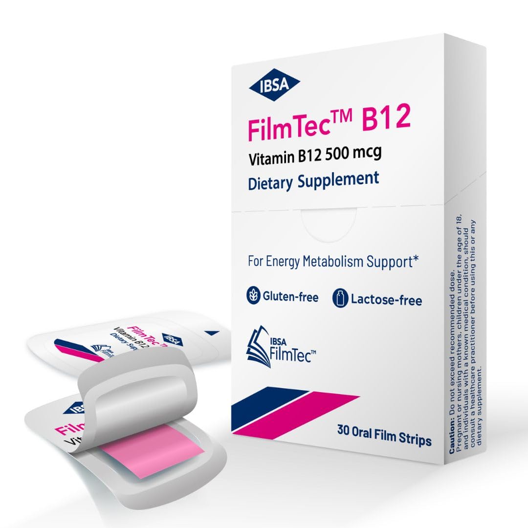 30-day supply with 30 easy-to-take oral dissolving films per carton . With pleasant tasting raspberry flavor . Free of gluten, lactose, sugar, and GMOs. Suitable for many dietary needs . A convenient way to improve daily Vitamin B12 intake – film strips can be taken any place, any time without water . FilmTec B12 is an oral dissolving film formulation made with IBSA's unique FilmTec technology for immediate release of the active ingredient . Vitamin B12 is a micronutrient that has been shown to be highly beneficial to the thyroid . Support healthy energy metabolism with a safe and effective vitamin B12 supplement .