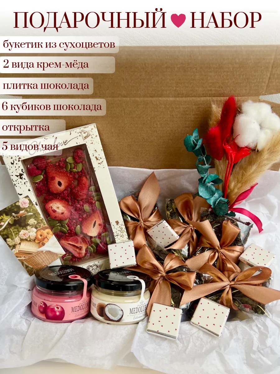 | Состав | открытка; букетик из сухоцветов; крем-мёд «С клюквой» 100мл; крем-мёд «С кокосом» 100мл; чай «Миндальный пирог» 20гр; чай «Спелый лимон» 20гр; чай «Сладкий апельсин» 20гр; чай «Японская липа» 20гр; чай «Каркаде» 20гр; шоколад Ручной работы с клубникой, малиной, тыквенными семечками 90-110гр; 6 кубиков молочного шоколада по 5гр |