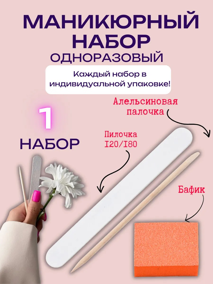 Профессиональный, одноразовый набор для маникюра, индививидуальный набор для ваших ногтей. В состав набора входит пилка для ногтей на деревянной основе. Крошка ровная, не крошится при работе мастера. Основа упругая, прекрасно держит форму. Апельсиновая палочка для удаления птеригий и отодвигания кутикулы, мини баф.Одноразовые наборы для маникюра и педикюра в индивидуальной упаковке. Отлично подойдут для мастеров ногтевого сервиса, которые ценят свое время, имидж и заботятся о здоровье своих клиентов.