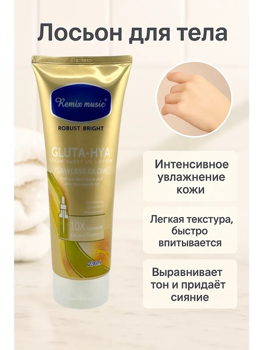 Лосьон с гиалуроновой кислотой дарит коже интенсивное увлажнение, делает её мягкой и бархатистой, возвращает здоровое сияние и гладкость. Активные компоненты — глутамин и ниацинамид — помогают осветлить следы пигментации, сократить темные пятна и улучшить общий тон. Средство имеет лёгкую консистенцию, равномерно распределяется, быстро впитывается и не оставляет липкости. Комплекс 10X гиалуроната насыщает влагой и поддерживает эластичность, способствуя упругости и свежему виду кожи. В состав входят вода, этилгексил метоксициннамат, ниацинамид, глутатион, гиалуронат натрия, ретинил пальмитат, масло семян подсолнечника, цистеин, глицин, триэтаноламин, феноксиэтанол, акрилаты, метилпарабен, пропилпарабен, дисодиум EDTA, лимонная кислота и другие ухаживающие вещества. Удобный формат 236 мл позволяет использовать средство ежедневно дома или в поездках, обеспечивая полноценный уход за телом.