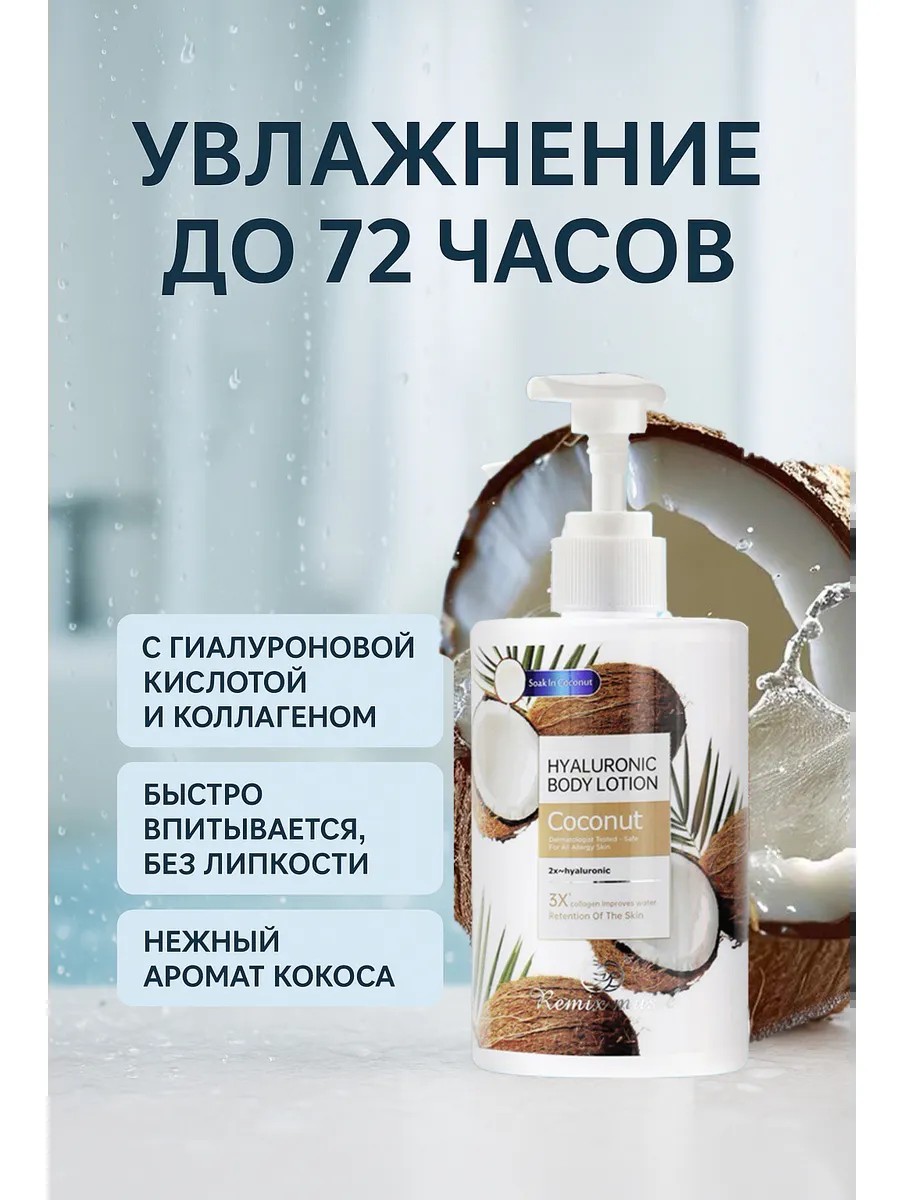 Лосьон 3 в 1 можно применять как ночной уход для ног, как крем для рук и как увлажняющее молочко после душа. Нежный тропический кокосовый аромат сохраняется до 24 часов, создавая ощущение свежести и ухода. Мощная формула на основе 2× гиалуроновой кислоты и 3× коллагена глубоко увлажняет и удерживает влагу до 72 часов, помогает уменьшить сухость и шелушения, делая кожу мягкой и гладкой.