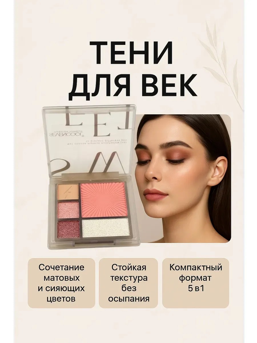 Тени для век палетка хайлайтер и румяна 5 в 1 — универсальное решение для макияжа глаз и лица. Набор сочетает матовые, сатиновые и сияющие текстуры, позволяя создать как дневной, так и вечерний образ. Компактный формат удобно брать с собой, а гармоничные оттенки легко комбинировать между собой. В палетке представлены тени, хайлайтер и румяна, которые обеспечивают стойкость, лёгкую растушёвку и естественное сияние.