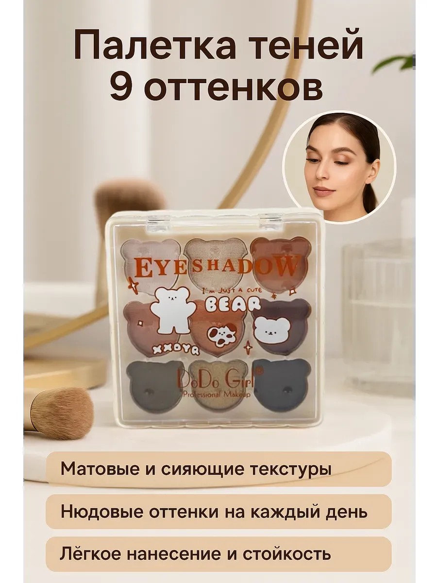 Палетка теней на 9 оттенков поможет создать как лёгкий дневной, так и выразительный вечерний макияж. В набор входят матовые и сияющие текстуры в нюдовой гамме — от нежных бежевых до глубоких коричневых тонов. Тени удобно комбинировать между собой, они легко наносятся, мягко растушёвываются и сохраняют стойкость в течение дня. Компактный футляр с оригинальным дизайном станет стильным аксессуаром в косметичке и подойдёт как для начинающих, так и для визажистов.