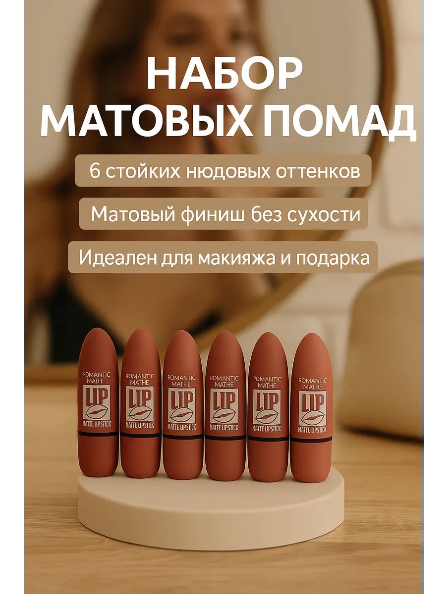 | Full product name | Set of matte lipsticks in nude shades, long-lasting, 6 pcs. |