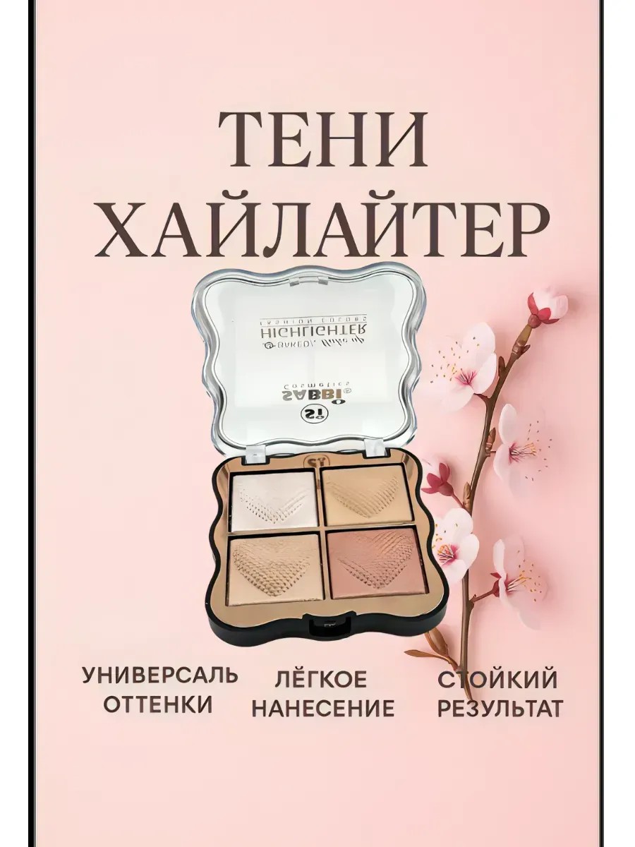 Тени хайлайтер в палетке из 4 оттенков — многофункциональное средство для макияжа, которое подходит и как сияющие тени для век, и как подсветка для скул, губ или зоны декольте. Запечённая формула даёт стойкость и насыщенный светоотражающий эффект, легко наносится и растушёвывается. Палетка сочетает светлые, золотистые, бронзовые и розовые тона, что позволяет создавать естественный дневной образ или выразительный вечерний макияж. Компактный формат удобно брать с собой, а светоотражающие частицы придают коже ухоженное сияние.