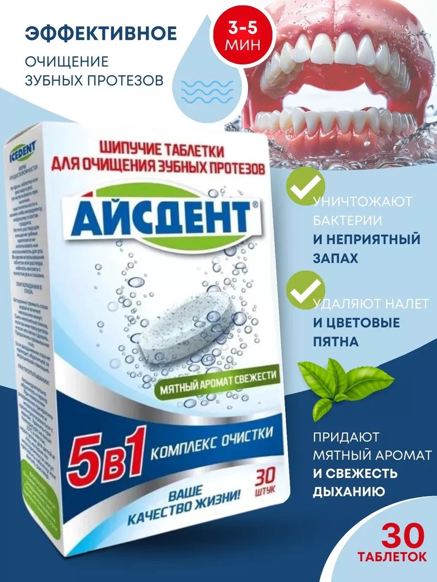 Таблетки для очищения зубных протезов "АЙСДЕНТ" «5 в 1» уничтожают бактерии, вызывающие неприятный, запах. Удаляют налет и цветовые пятна, придают мятный аромат и свежести.