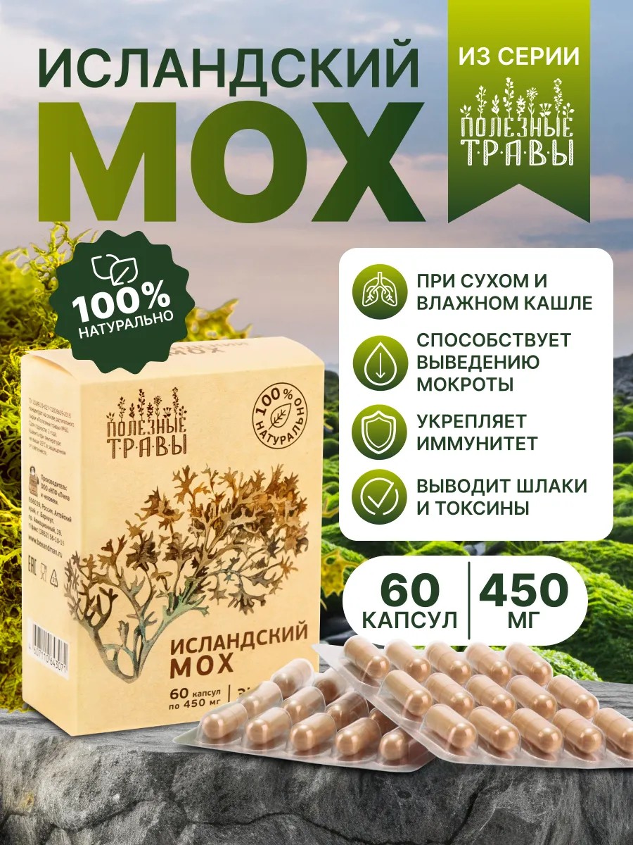 Вы можете найти исландский мох в разных формах выпуска: измельченный , сушеный , в виде пищевой добавки. В отличие от порошка или чая, капсулы обеспечивают точную дозировку и удобство приема, не имея неприятного вкуса или запаха. И их можно не бояться транспортировать.