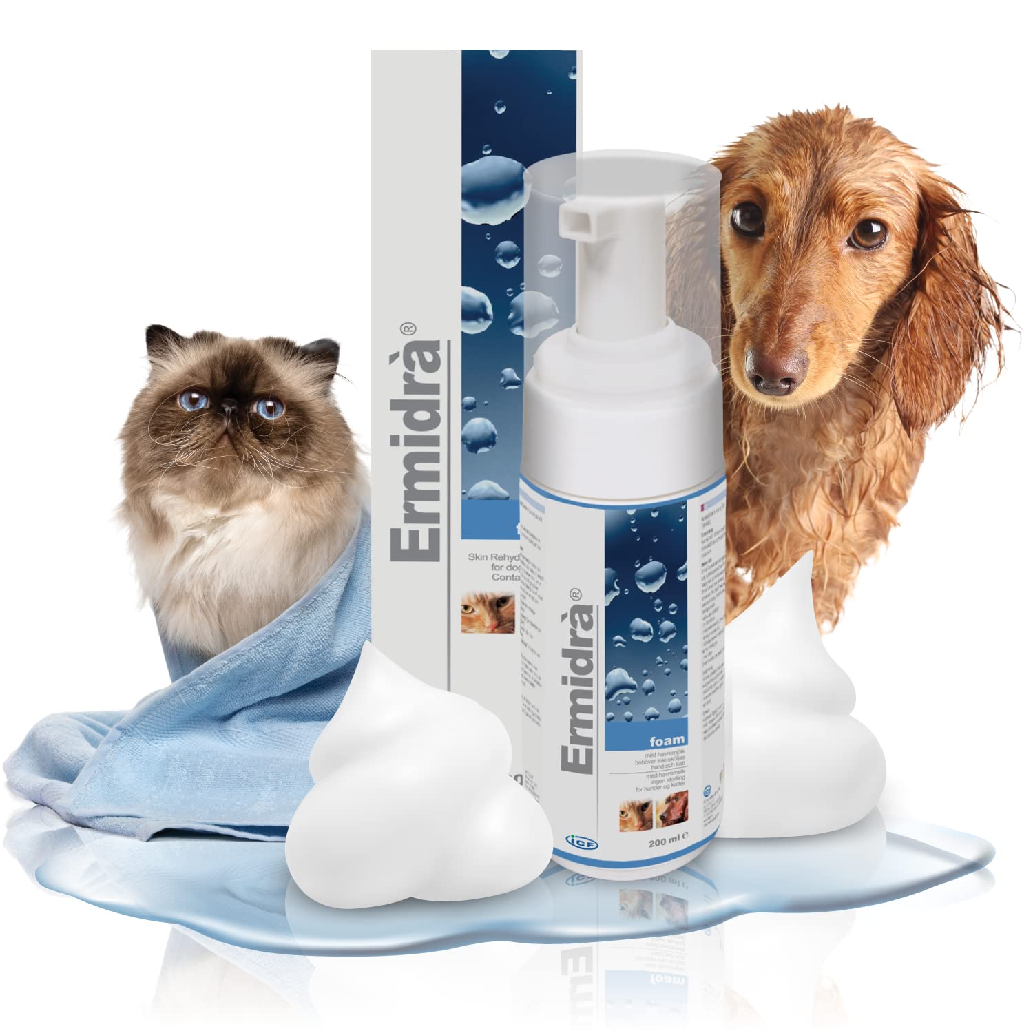Ermidra Mousse 200 MLPrevents bath stress. Leaves fur silky and shiny. Soothes itchy skin. Cleans quickly and effectively, without water. Foaming shampoo for dogs and cats. Ermidra Mousse 200 MLEvite le stress provoqué par le bain. Rend les poils soyeux et brillants. Adoucit la peau lors de démangeaisons. Lave, rapidement et efficacement, et sans eau. Shampoing mousse pour chiens et chats.