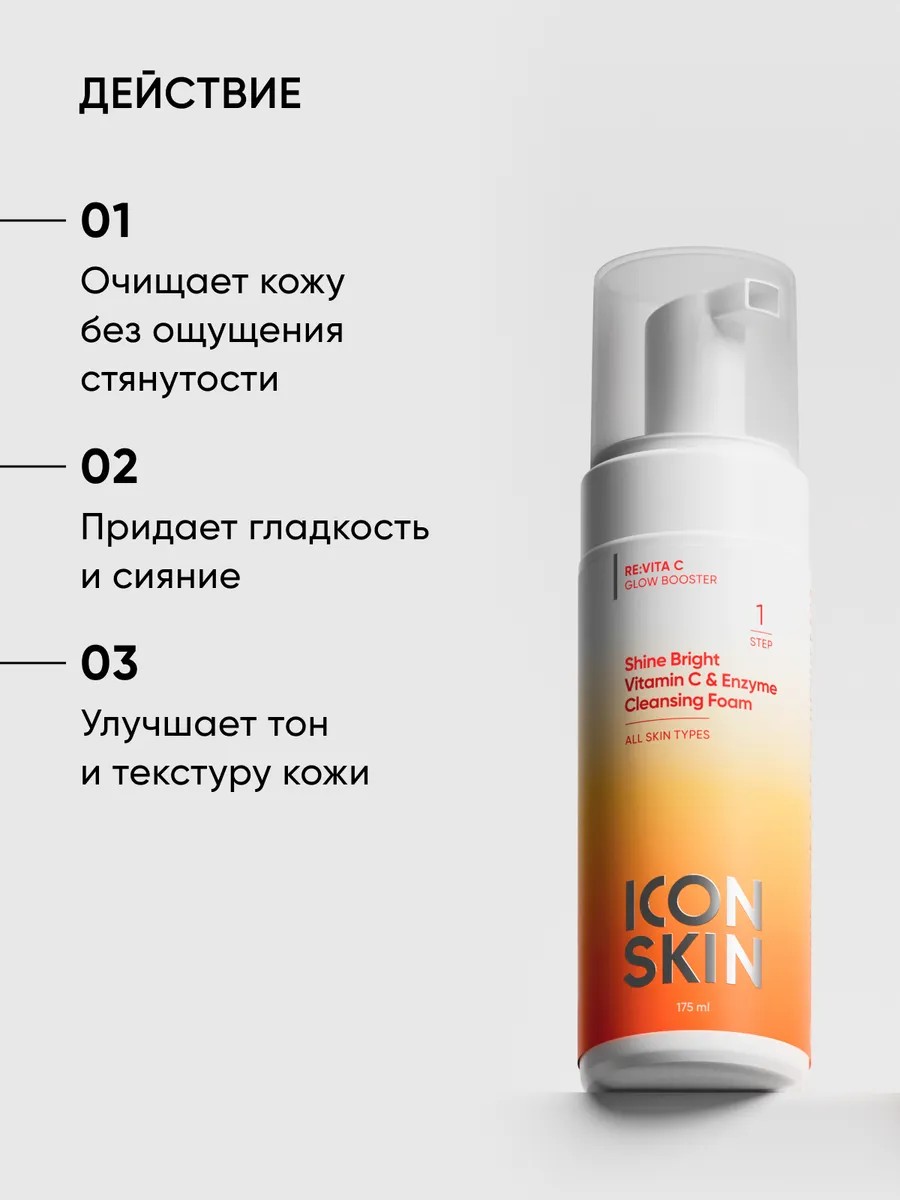 Пенка для умывния лица дает мягкое очищение и легкий отшелушивающий эффект в одном флаконе: пенка для умывания идеальная подготовка кожи к активному уходу. Воздушная бессульфатная пенка эффективно удаляет с кожи загрязнения и остатки макияжа. Мягко отшелушивает ороговевшие чешуйки и стимулирует обновление клеток, выравнивая тон и текстуру кожи. Обладает антиоксидантным действием, заряжает кожу энергией и улучшает цвет лица, осветляет пигментацию и следы постакне. Не вызывает ощущения сухости и стянутости. Рекомендована для всех типов кожи, особенно тусклой и склонной к пигментации. Благодаря содержанию В составе синергетического коктейля витамина С, феруловой и лимонной кислот пенка заметно выравнивает тон лица и активирует естественное сияние. Энзимы ананаса, папайи и тыквы растворяют верхний слой ороговевших клеток, обеспечивают более качественное очищение и гладкость кожи. Гиалуроновая кислота и бетаин помогают поддерживать правильный уровень увлажнения и защитный барьер. Алоэ вера и пантенол заживляют, успокаивают и восстанавливают кожу. Экстракт солодки повышает ее иммунитет. Результат: чистая сияющая кожа, более ровный цвет лица. СПОСОБ ПРИМЕНЕНИЯ: нанести достаточное количество пенки на влажную кожу лица, избегая области вокруг глаз. Помассировать в течение 30-60 секунд, смыть обильным количеством воды. Подходит для ежедневного применения. Процесс очищения завершить тоником-активатором сияния с витамином С . Дополнить уход вы можете сывороткой для лица с 3D витамином С и гиалуроновой кислотой SUPREME GLOW. Для достижения максимального эффекта ровного тона и сияния рекомендуем применять все средства серии RE:VITA C в комплексе или комбинировать средства из разных серий ICON SKIN, исходя из потребностей вашей кожи.